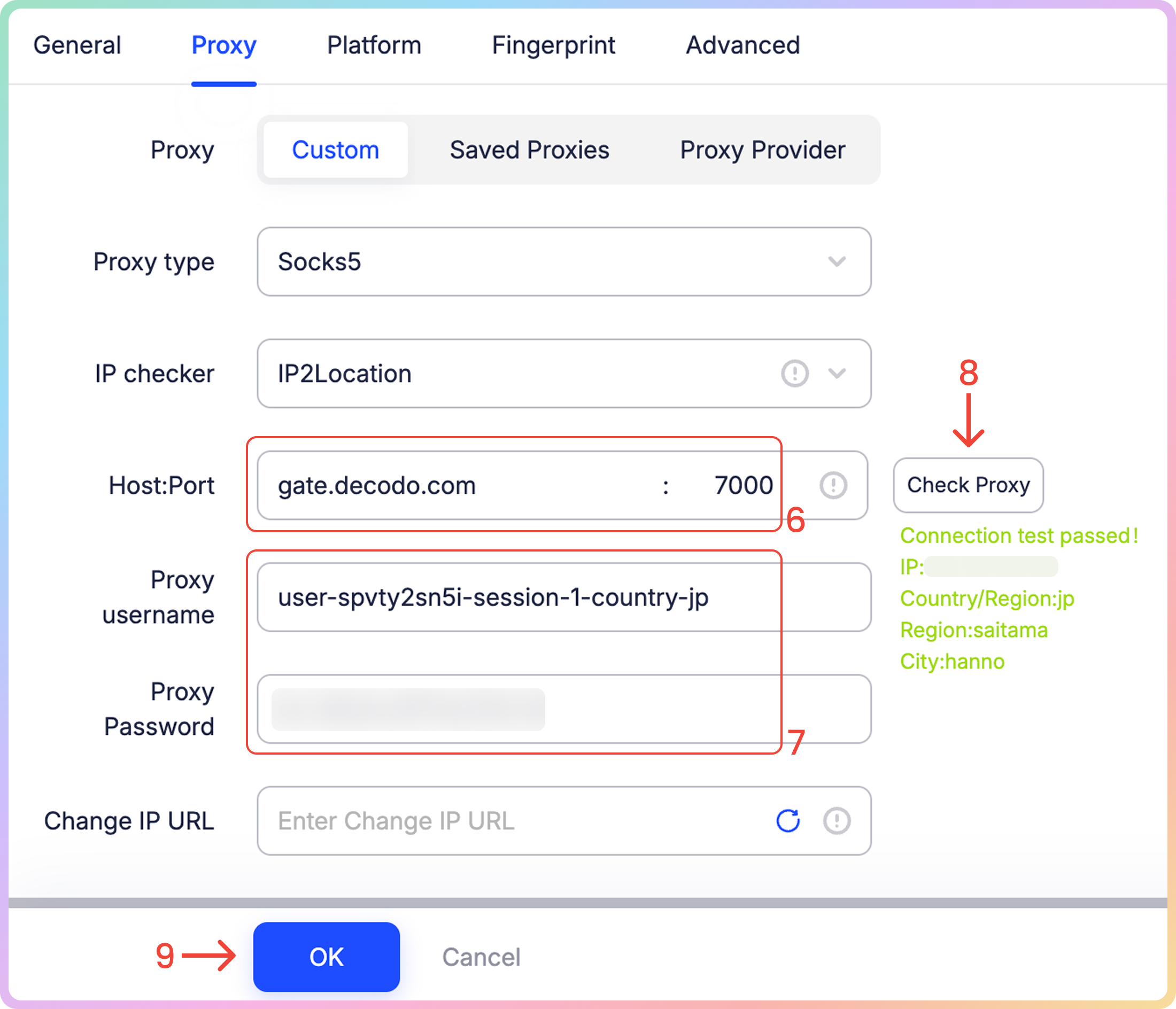 Step 6. Fill in the Host:Port (e.g., jp.decodo.com:30001).