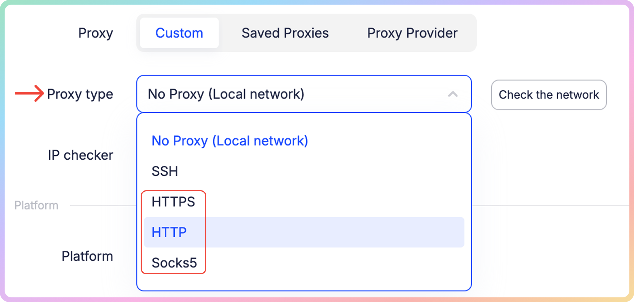 Step 5. Select the Proxy type: HTTP, HTTPS or SOCKS5.