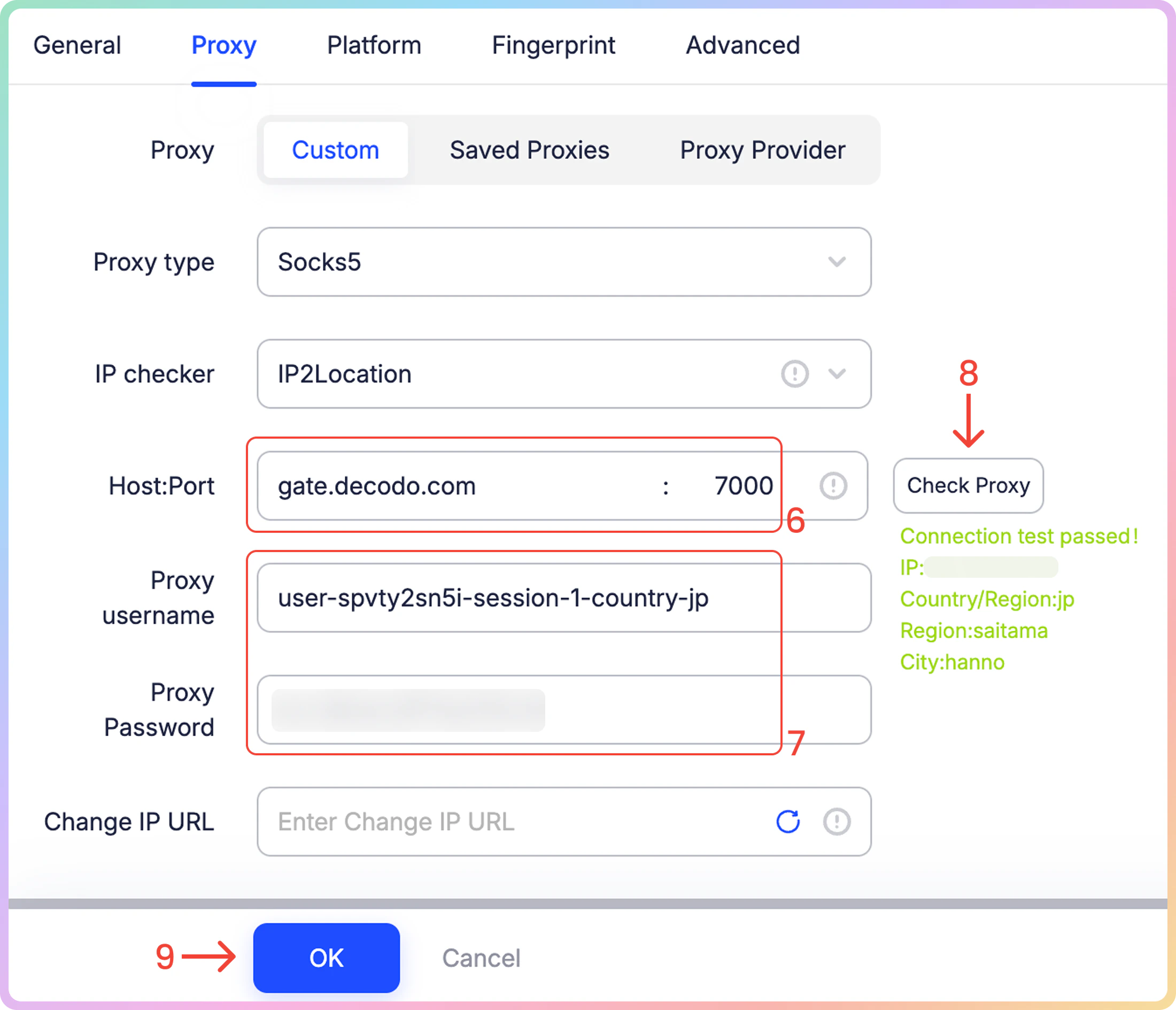 gate.decodo.com 端点和 7000 端口才能使用 SOCKS5 住宅或移动代理。国家端点(如 us.decodo.com)将无法工作!您可以通过在用户名中使用高级****参数指定位置来定位特定位置:- 例如: