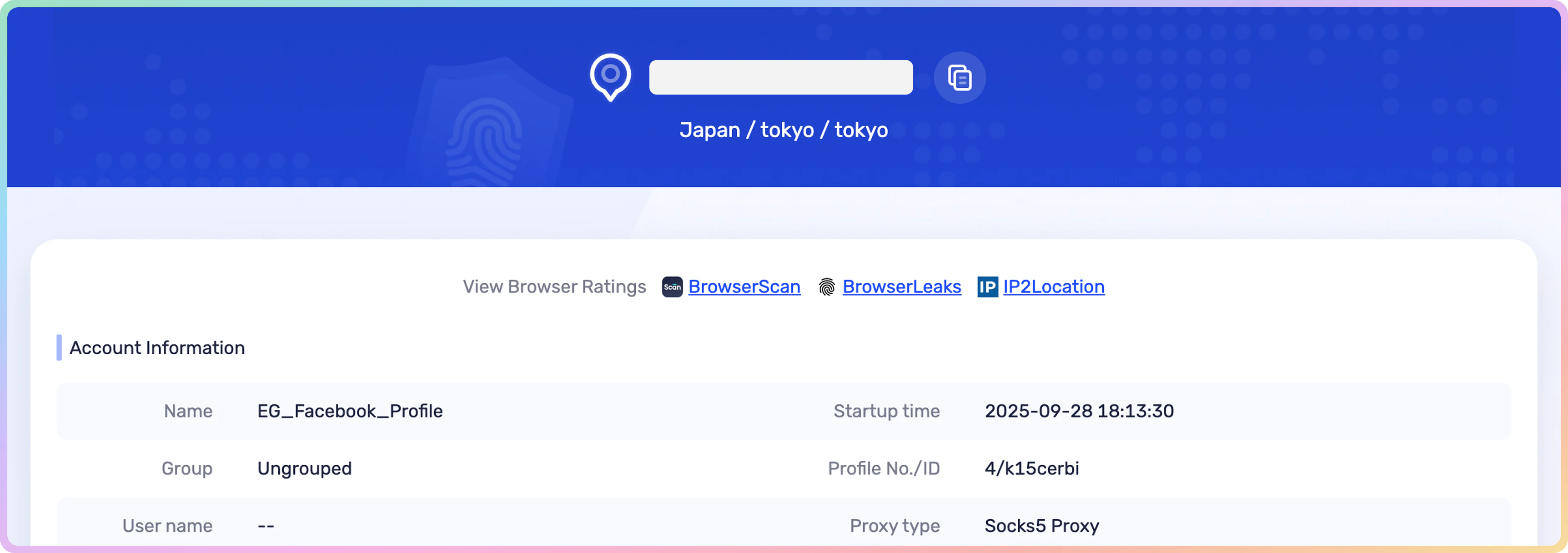 - 启动配置文件后,AdsPower 将打开一个网页,显示代理 IP、配置文件详细信息和浏览器指纹详细信息(如下所示)。但是,某些数据库可能已过时。要获取最新的 IP 信息,请访问 ip.decodo.com。如果成功,您的 IP 地址将显示代理的位置。