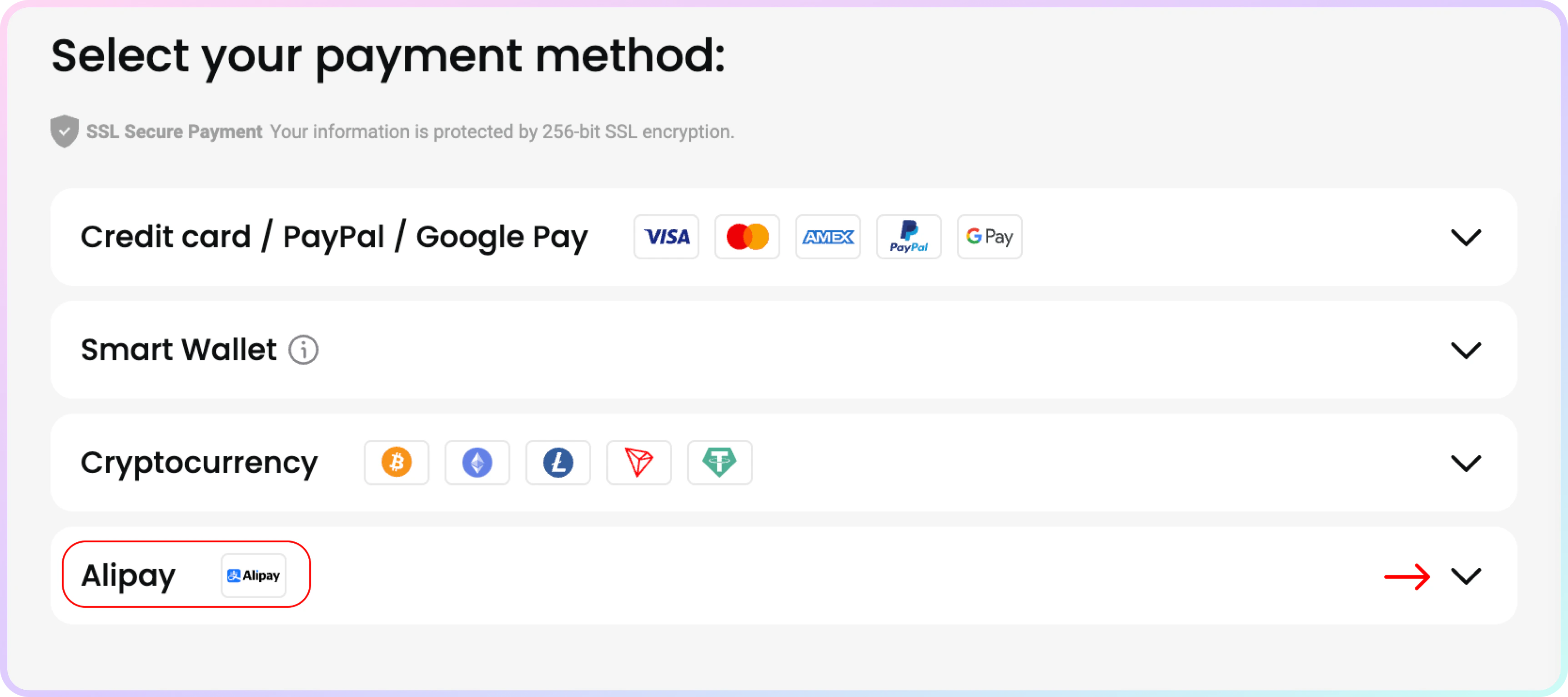 您可以在结账时找到支付宝支付选项,选择它并填写详细信息。支付宝仅在亚洲地区可用。