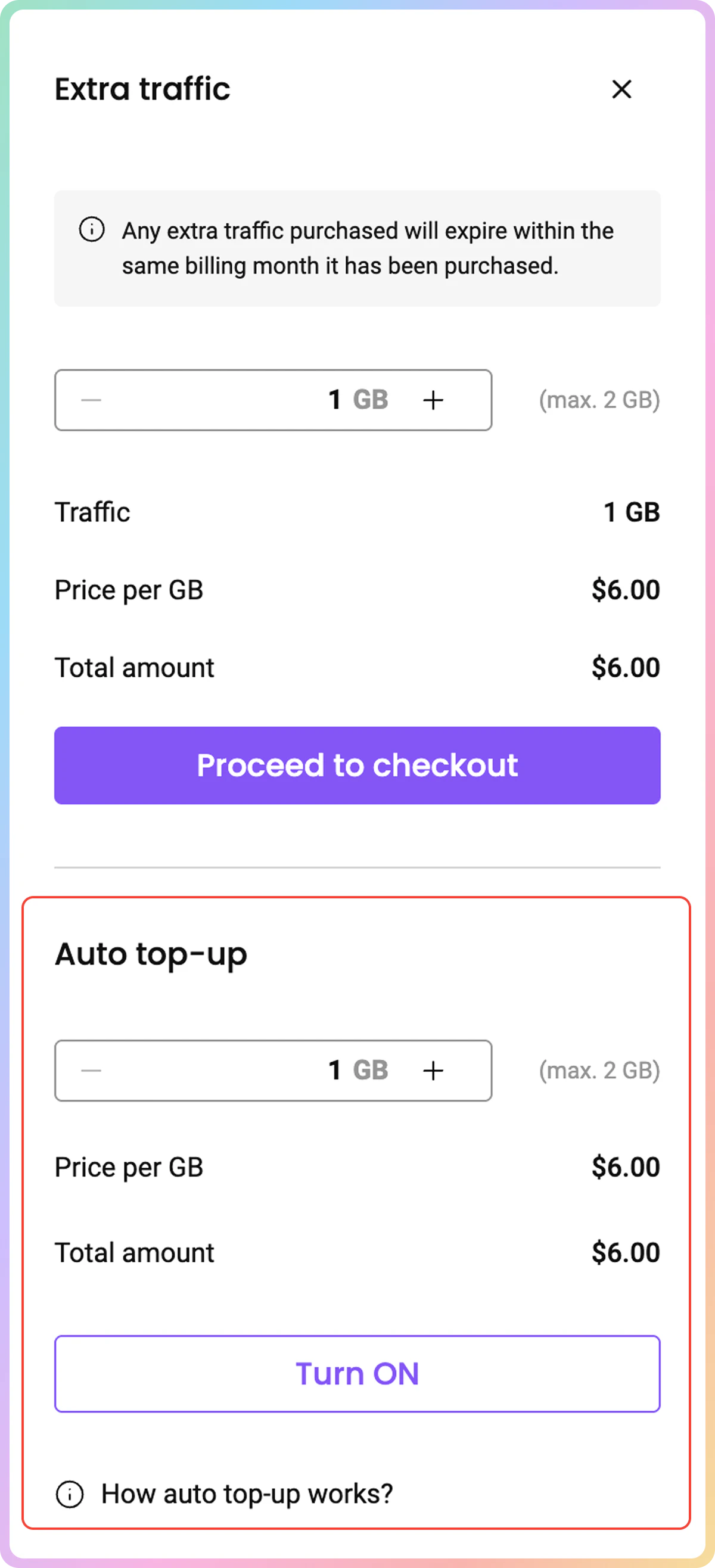 自动充值流量的每 GB 价格与手动充值额外流量的价格相同。您将使用购买订阅时使用的相同付款方式进行扣费。