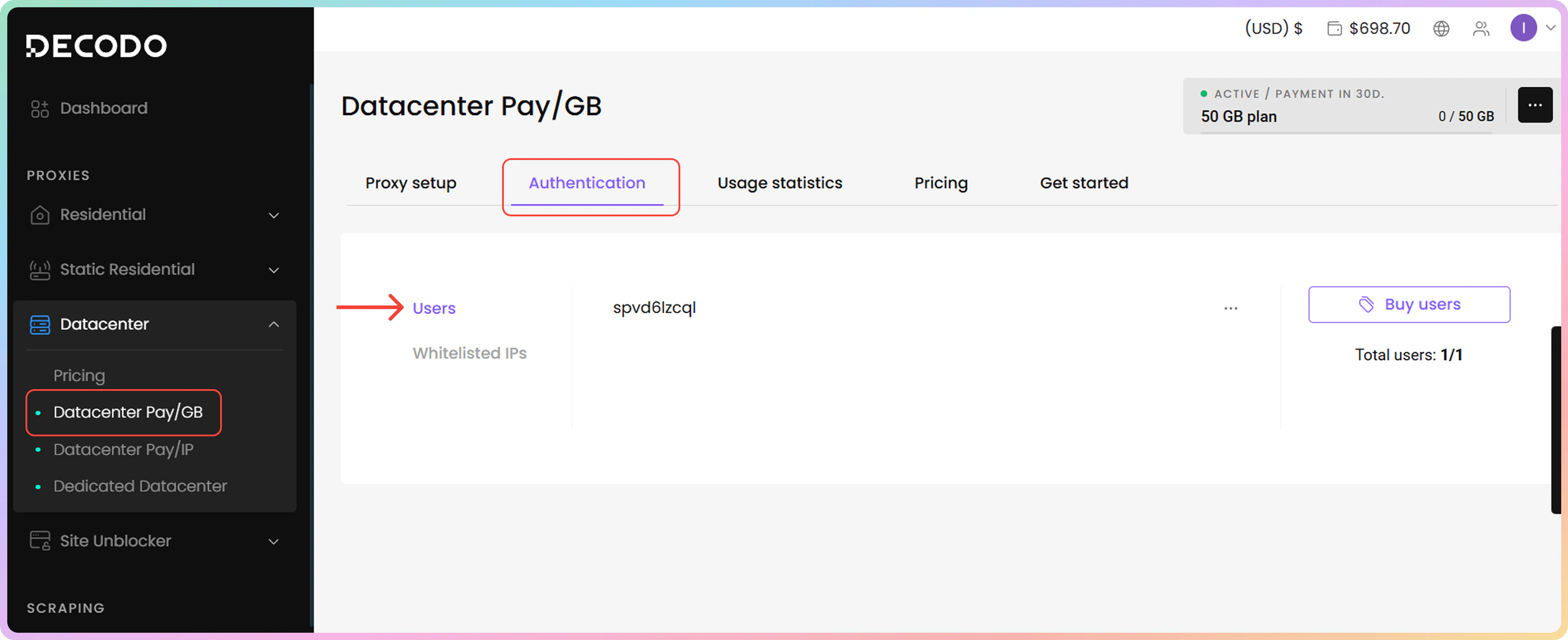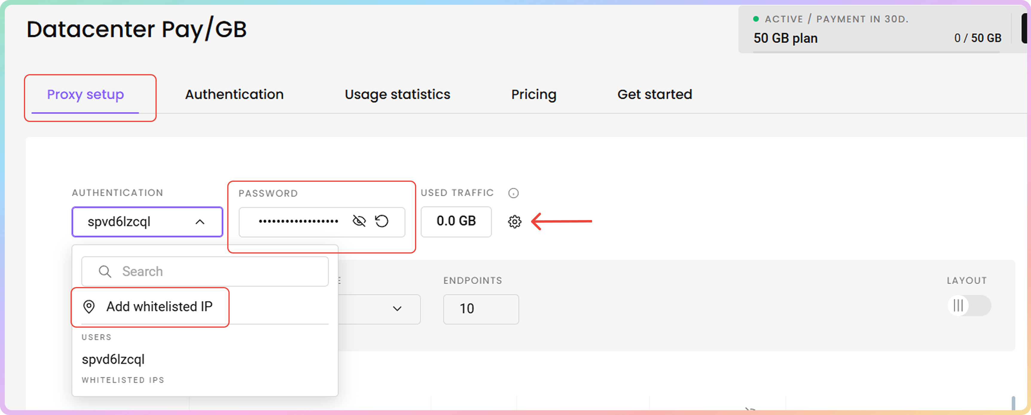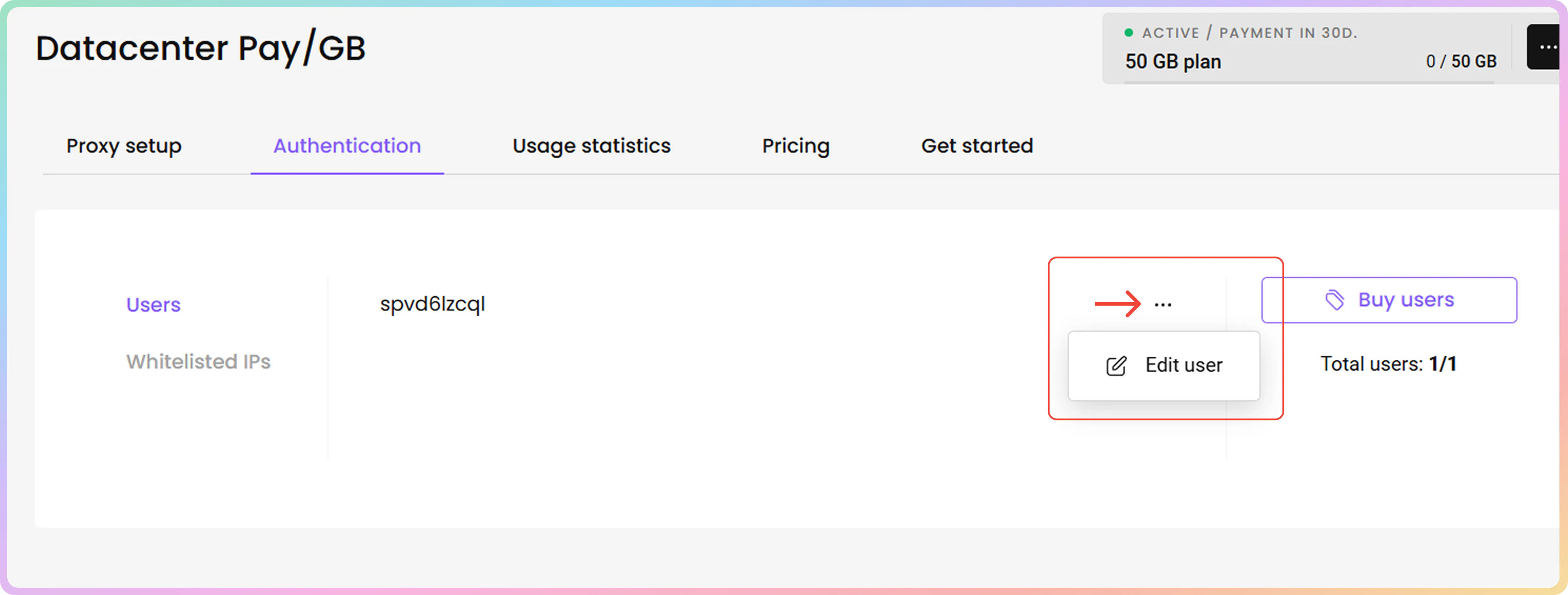 - 购买订阅后,系统将在身份验证部分自动生成代理用户名和密码。