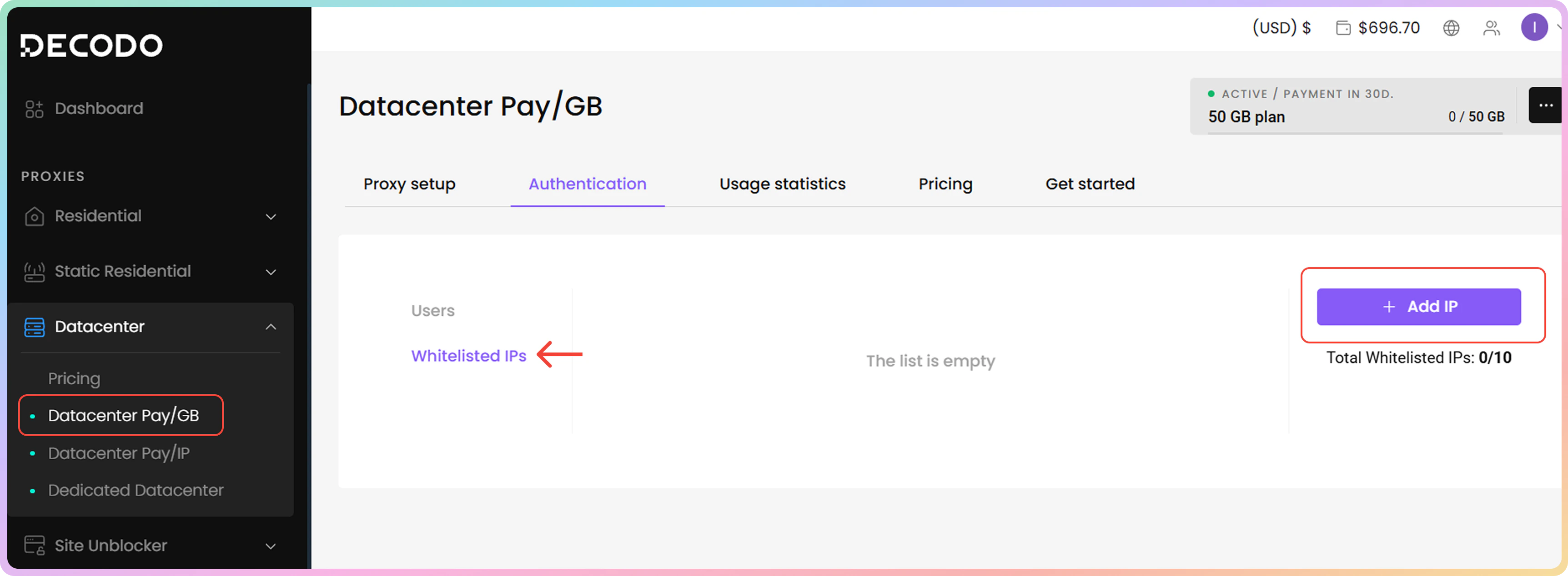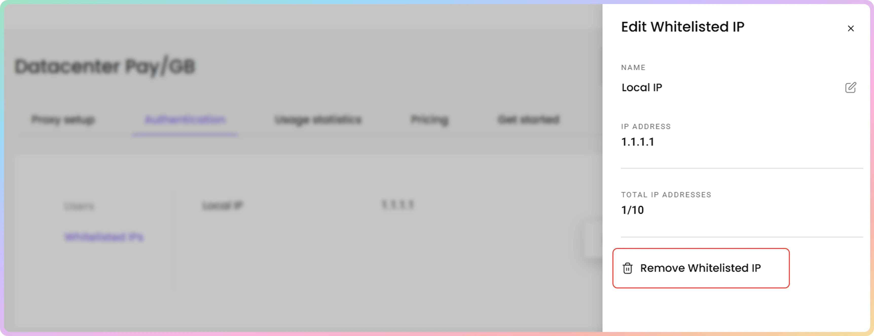 - 您可以通过点击身份验证部分的白名单IP选项卡来管理您的白名单IP。