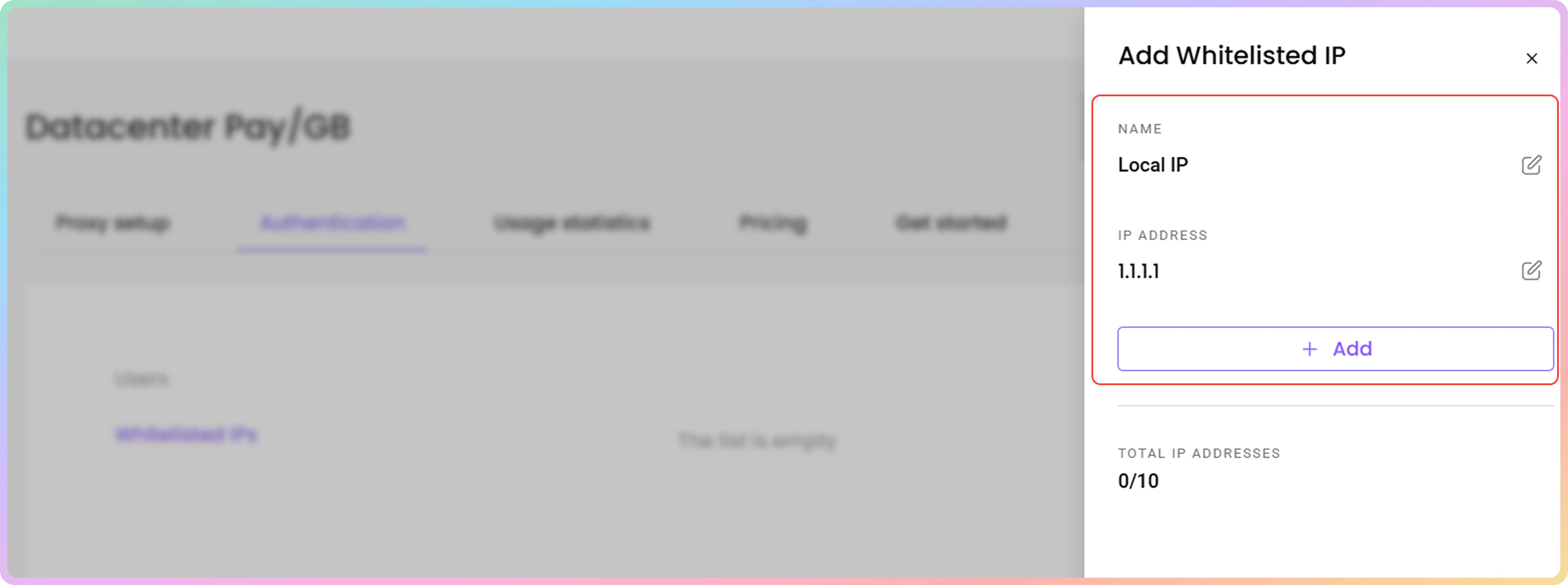 - 输入您想要的IP地址,然后点击**+ 添加将其加入白名单。如果您愿意,也可以为其命名**。