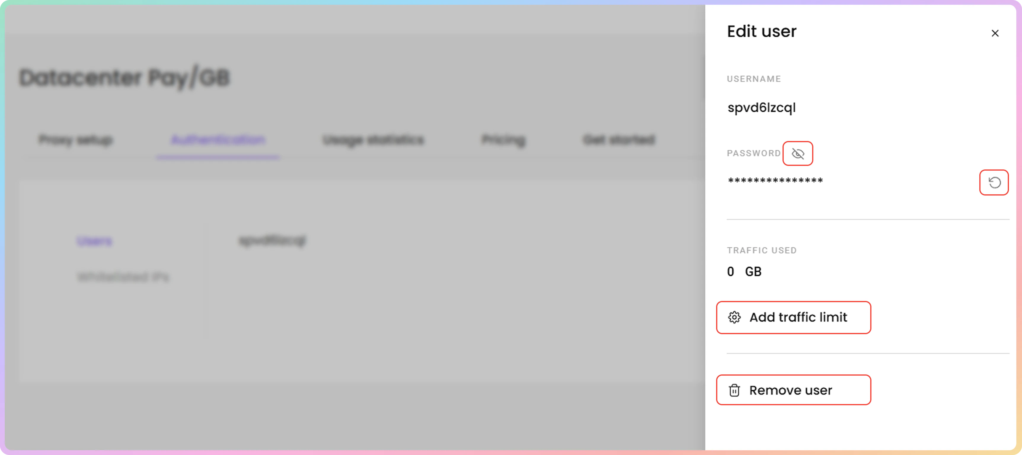 - 或者,您可以直接在代理设置部分添加或编辑代理用户、生成密码并更改其流量限制。