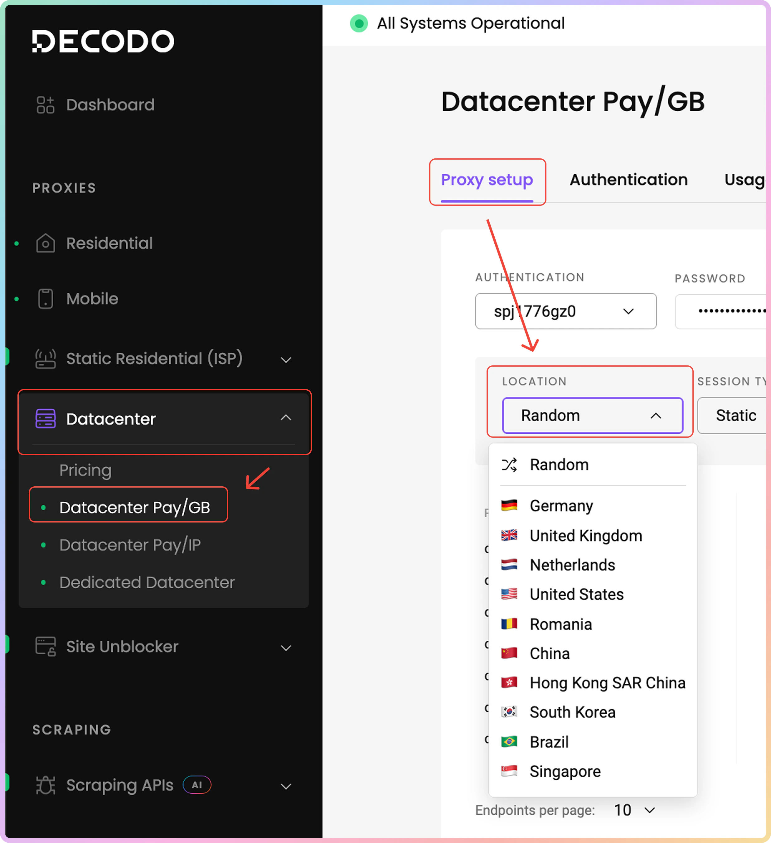 如果您希望生成端点列表(然后可以导出)或带有国家的请求示例,请导航到数据中心 → 数据中心按流量付费 → 代理设置仪表板页面。点击位置字段,在下拉菜单中,随意选择其中一个国家。