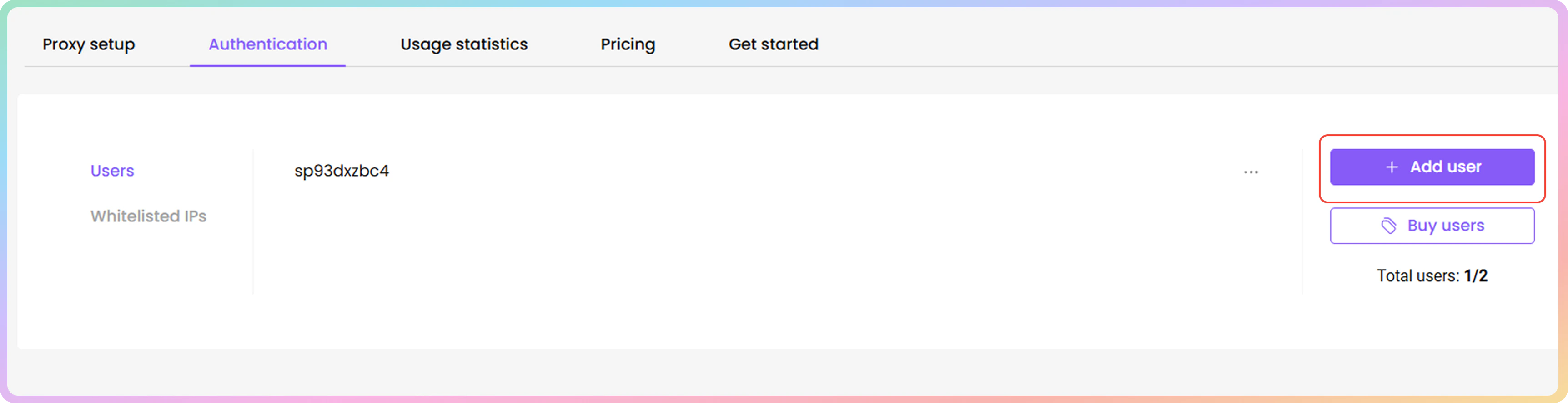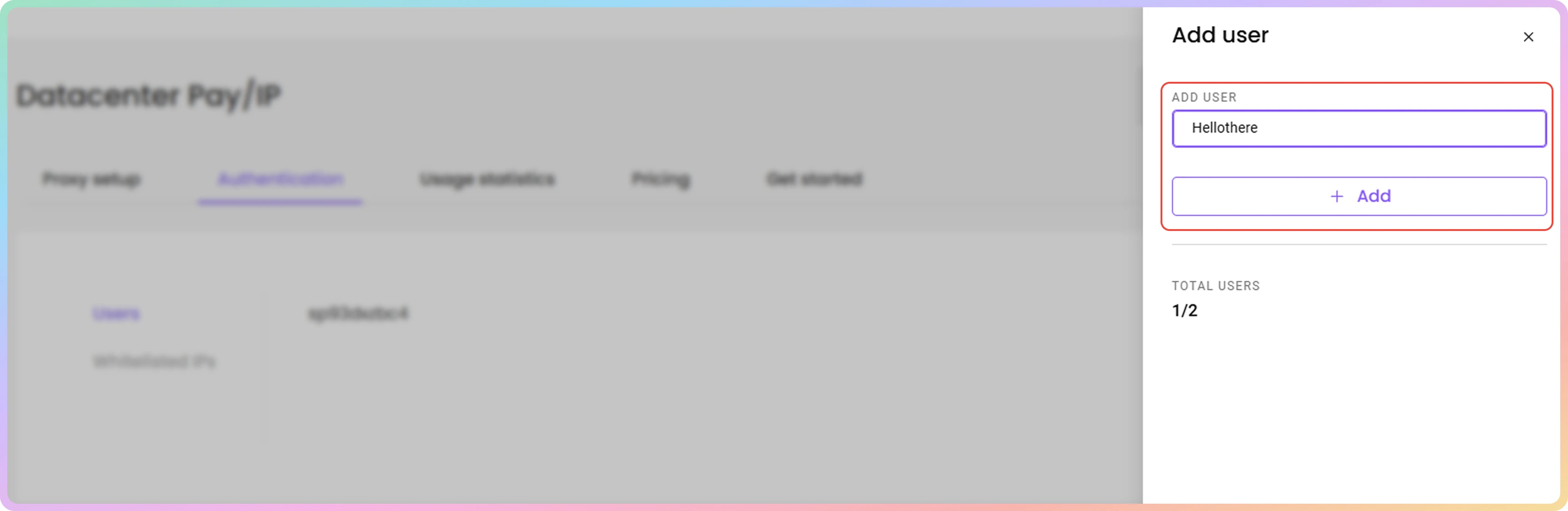 - 要创建新的代理用户名和密码,请点击**+ 添加用户**。右侧将打开一个菜单。