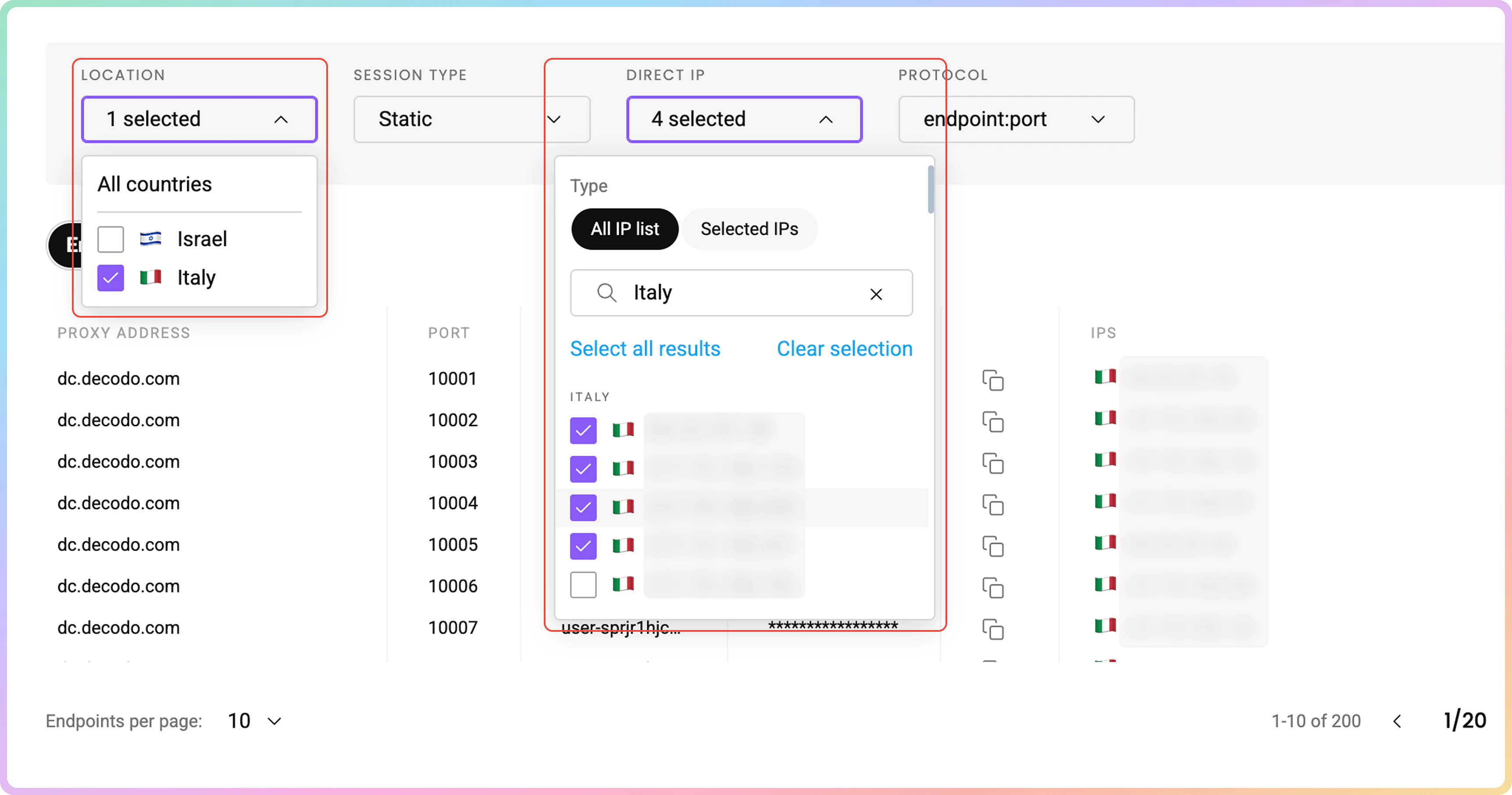- IP 选择将限于位置下选择的国家(所有国家将提供完整列表)。