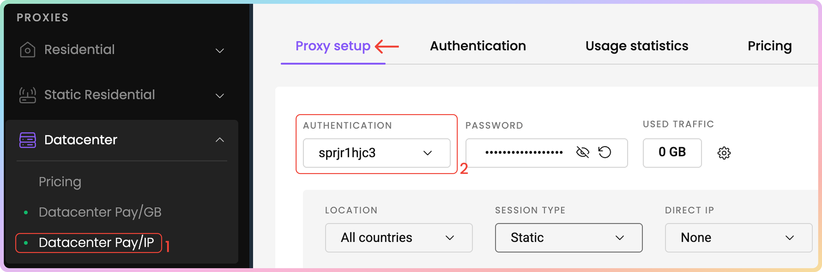 - 首先,导航到仪表板上的数据中心 → 数据中心按IP付费 → 代理设置页面,并查找身份验证部分。