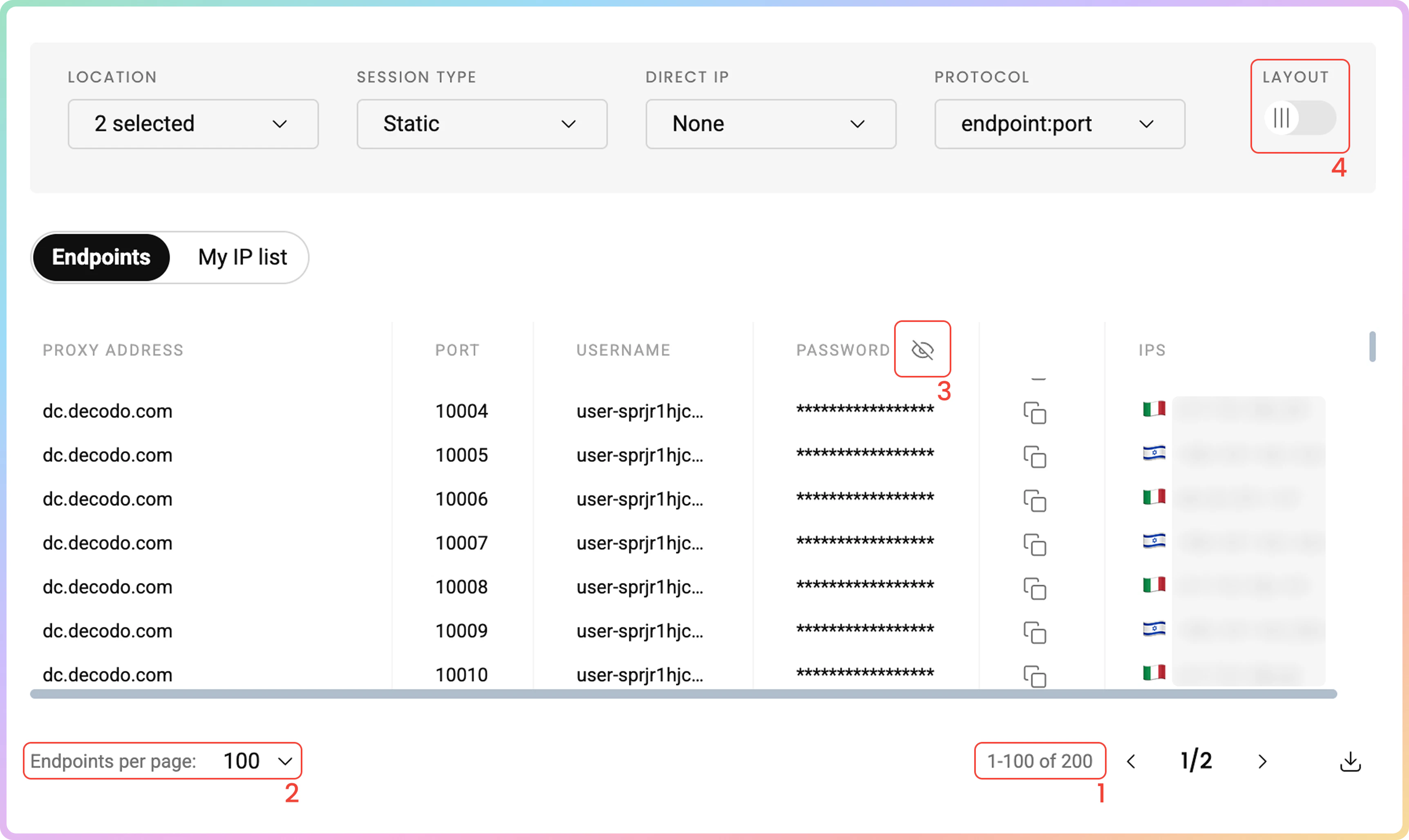 在代理设置部分完成设置后,您将看到根据您的选择生成的端点和端口的代理列表。- 只需将其复制到剪贴板,或下载创建的代理列表的