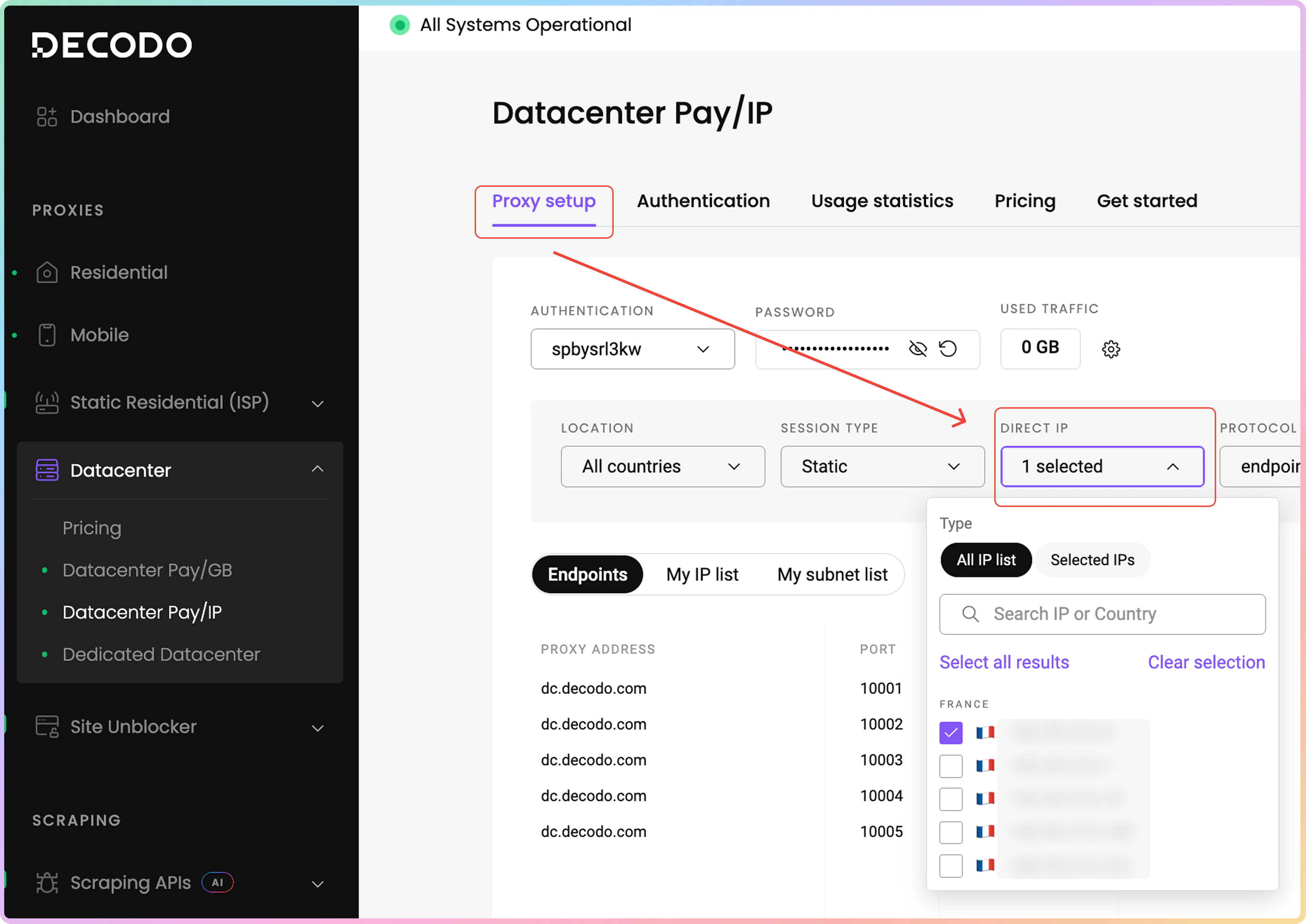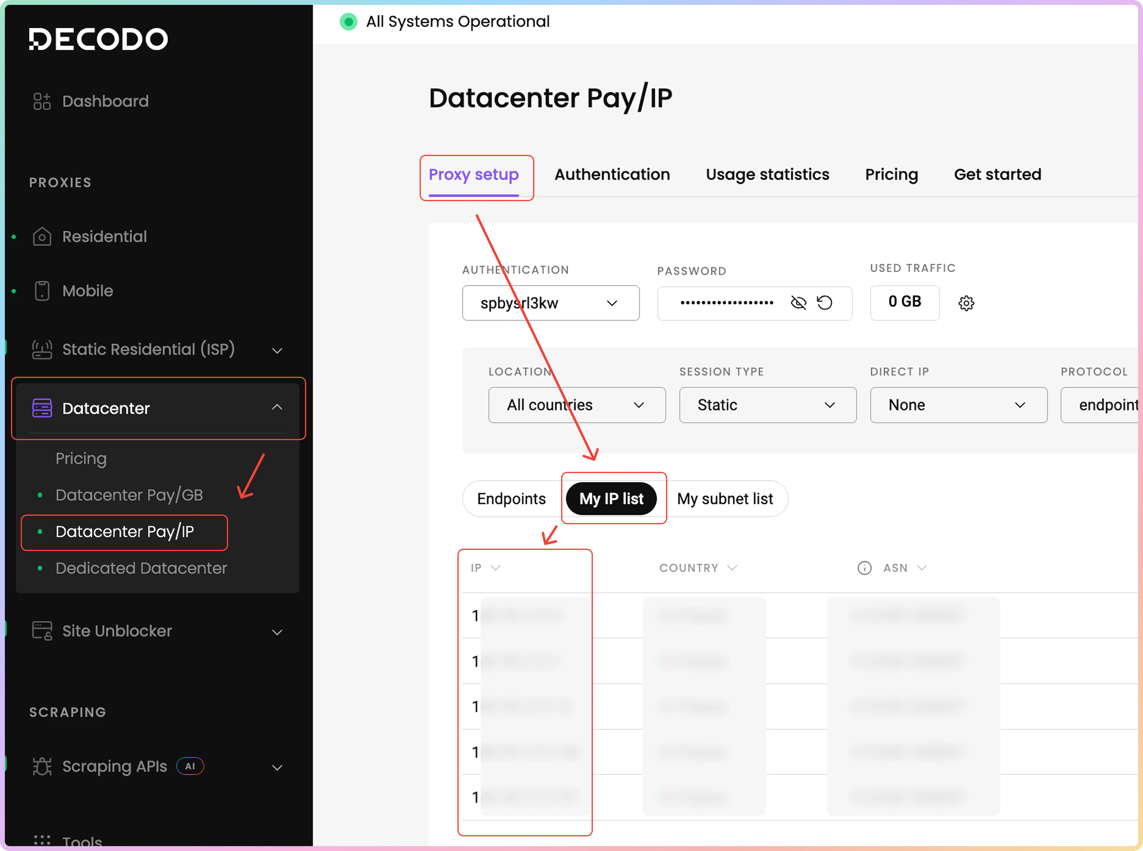可以从您购买的代理IP列表中定位特定的IP地址。要查找您的代理IP,请导航至数据中心 → DC按IP付费 → 代理设置仪表板页面。然后,点击我的IP列表选项卡。在下面的表格中,您将找到您购买的IP地址、它们的原产国家和ASN。请记住,列出的某些IP可能没有关联的ASN。