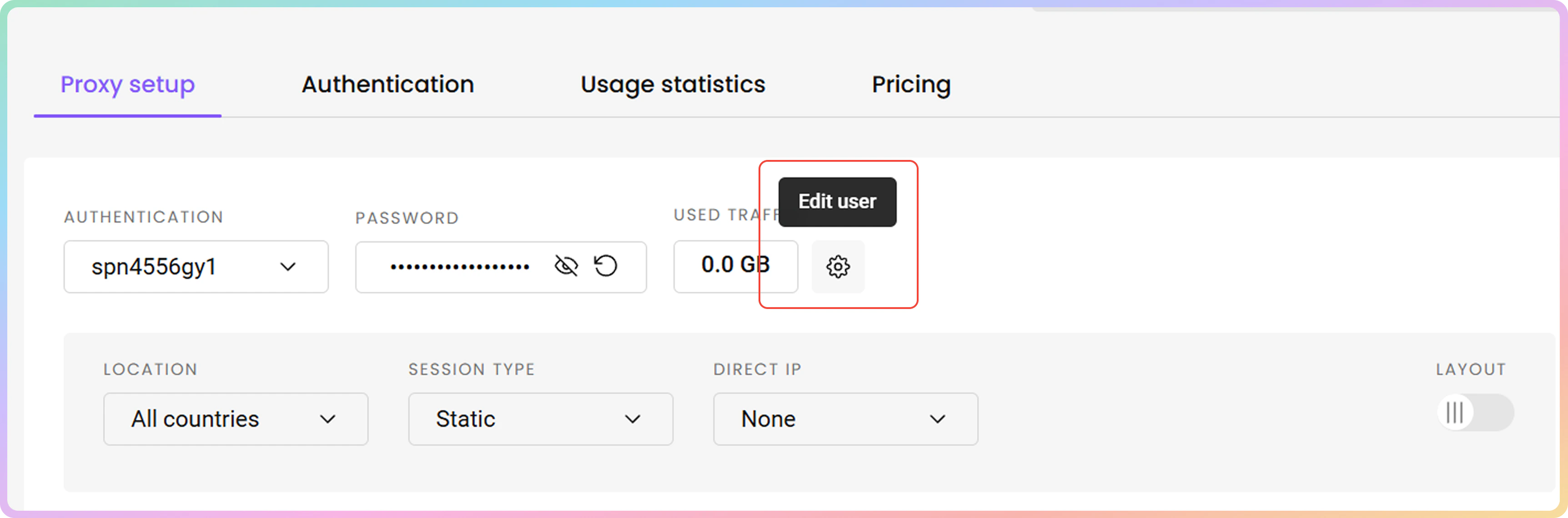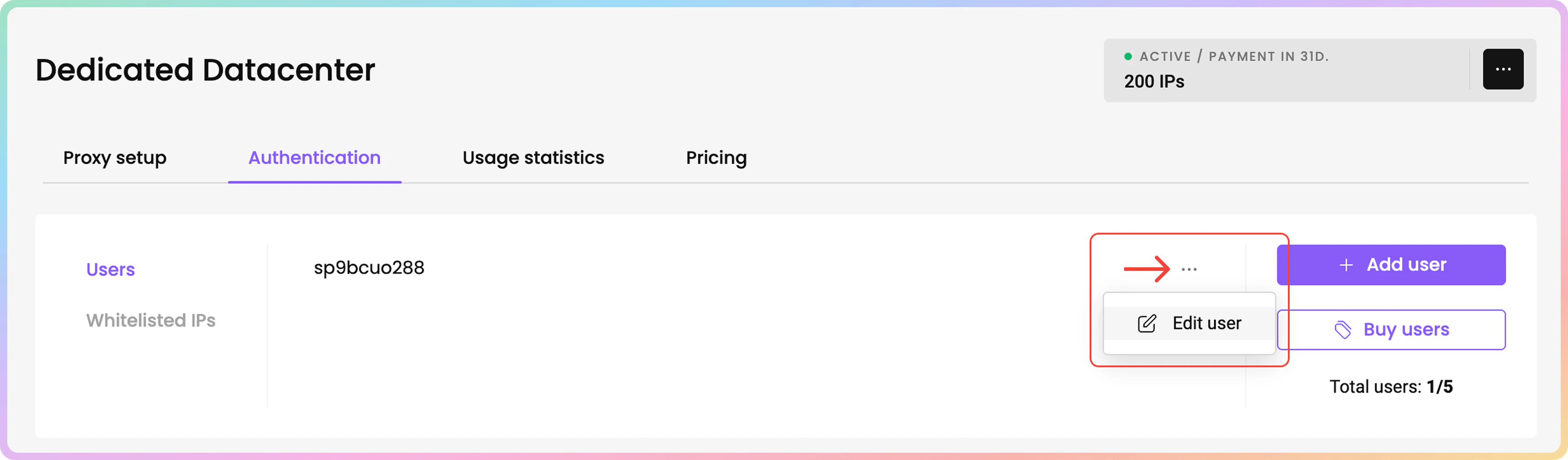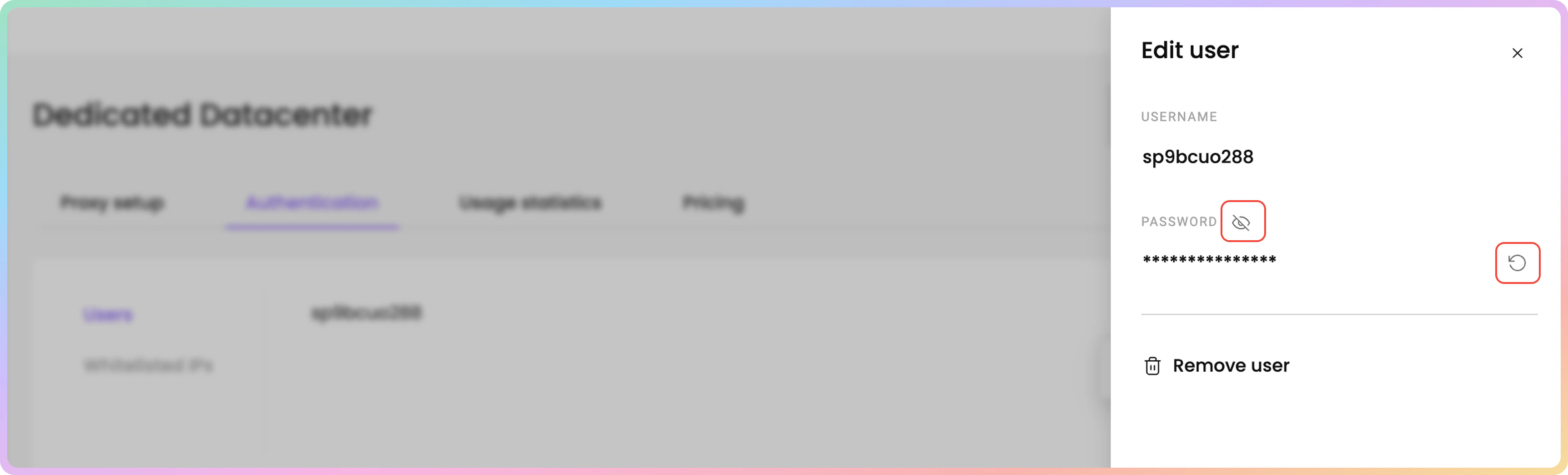 - 购买订阅后,代理用户名和密码将自动在身份验证部分生成。