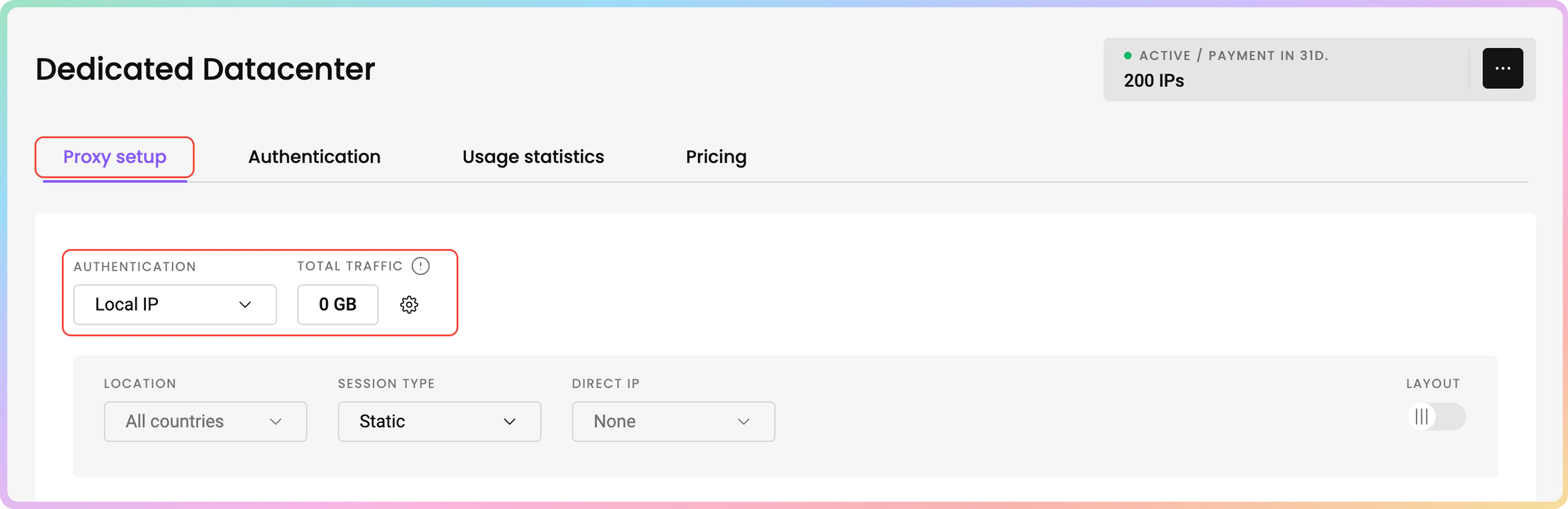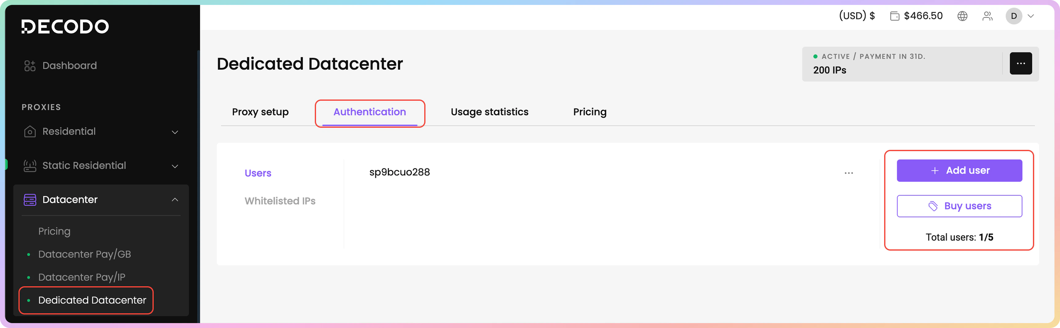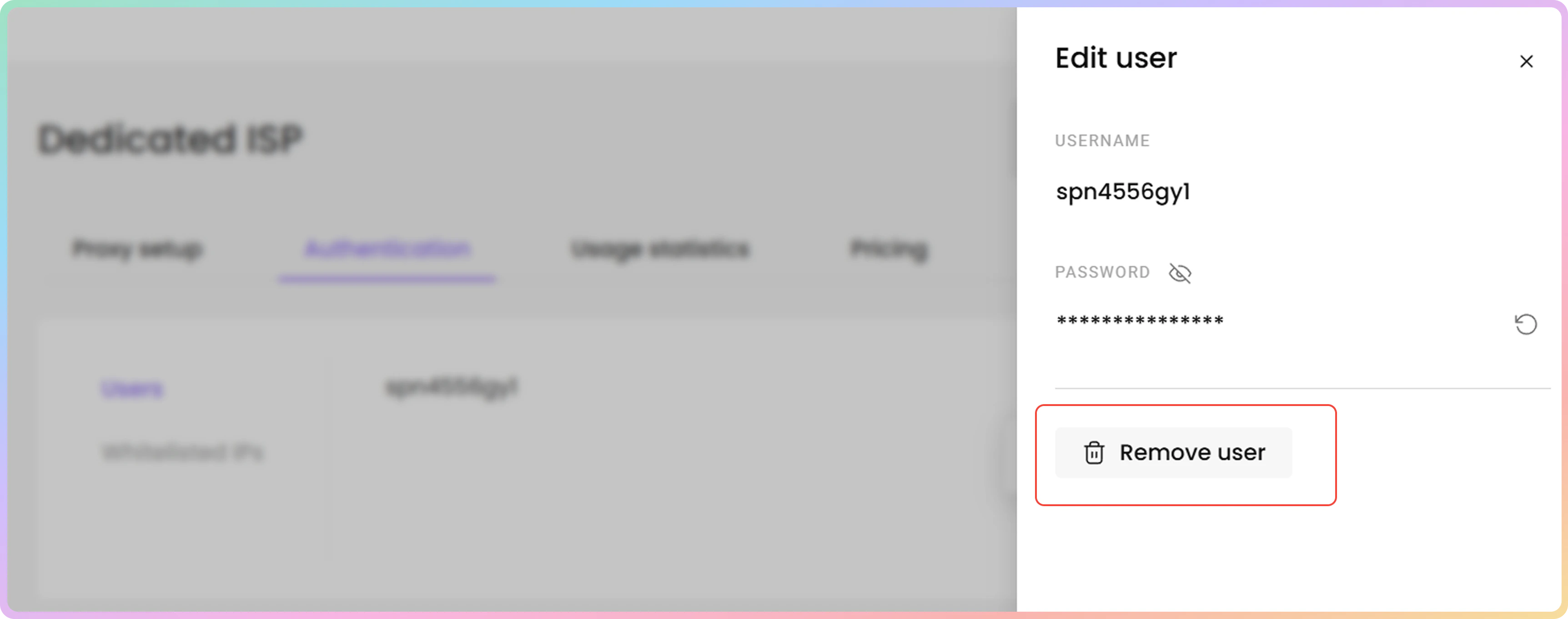 - 购买订阅后,代理用户名和密码将自动在身份验证部分生成。