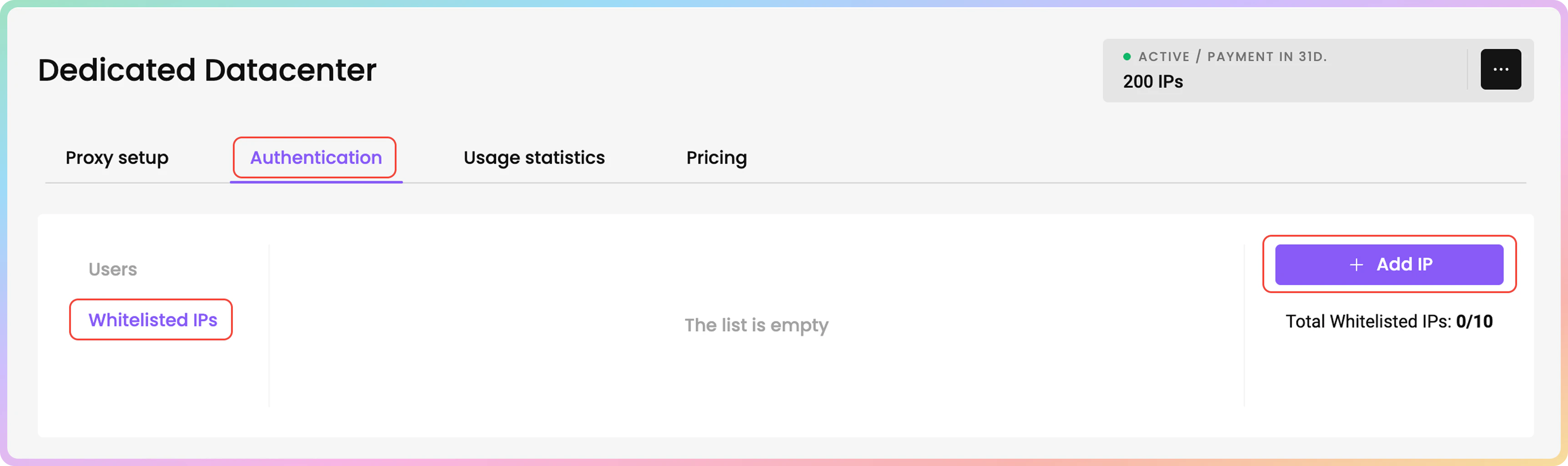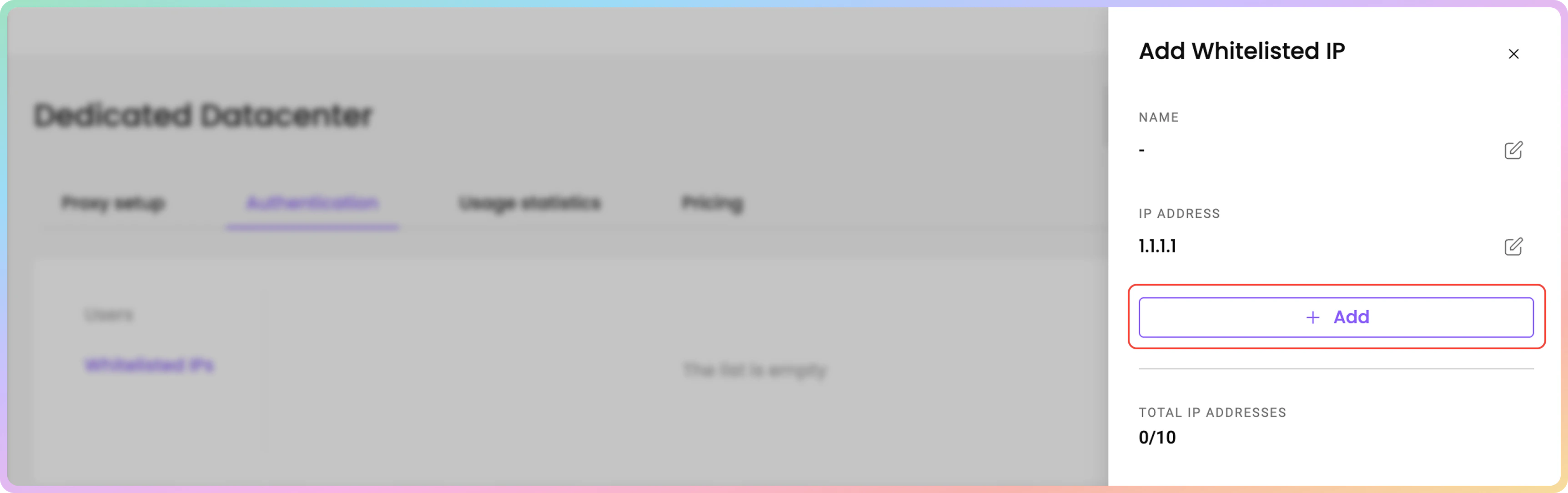 - 您可以通过点击身份验证部分的白名单IP选项卡来管理您的白名单IP。