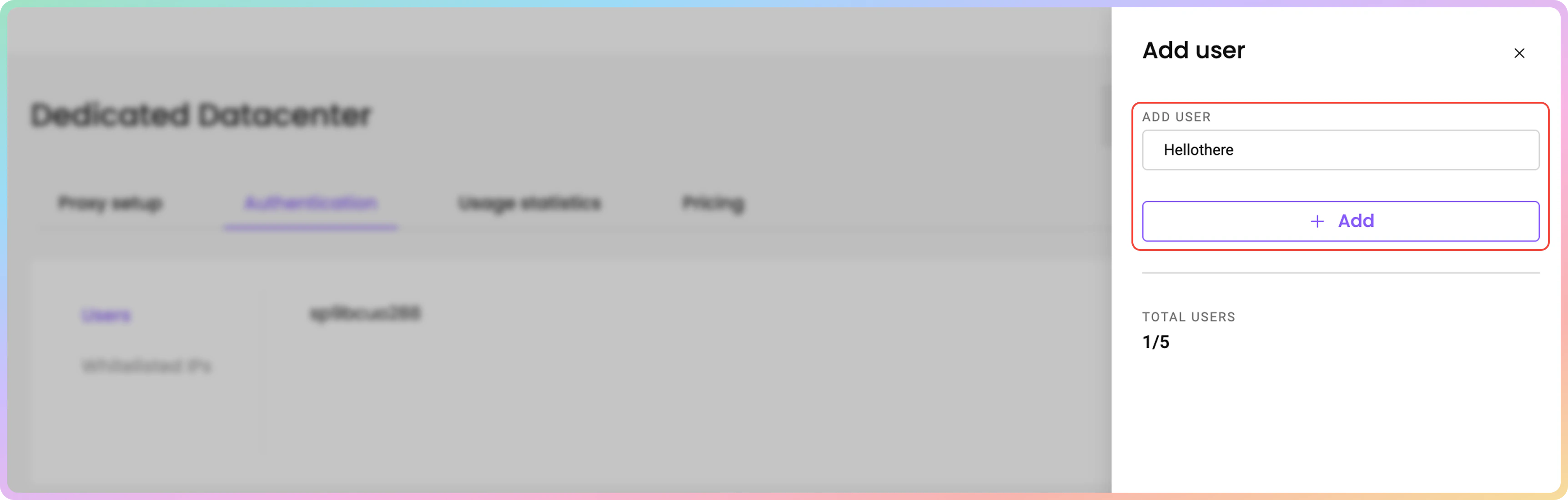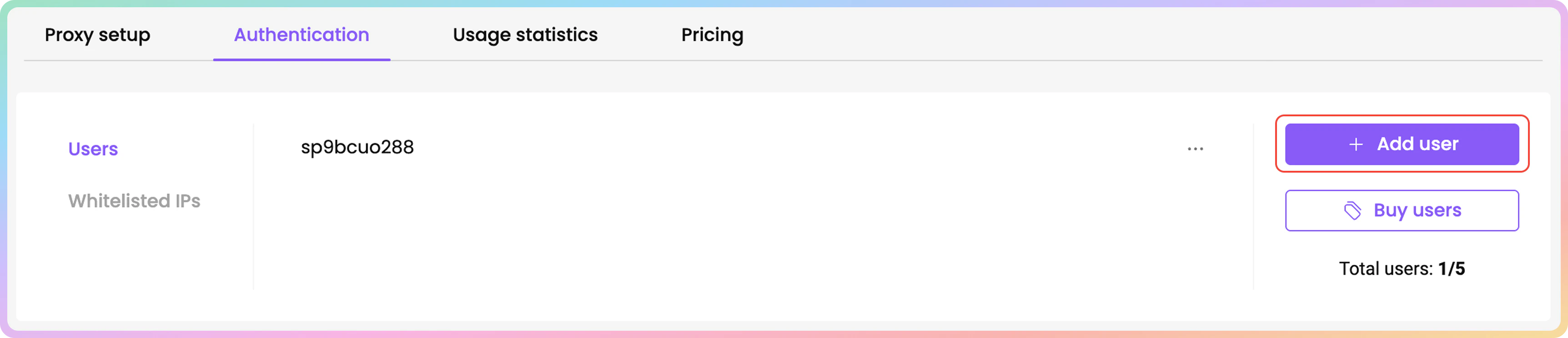 - 要创建新的代理用户名和密码,请点击**+ 添加用户**。右侧将打开一个菜单。