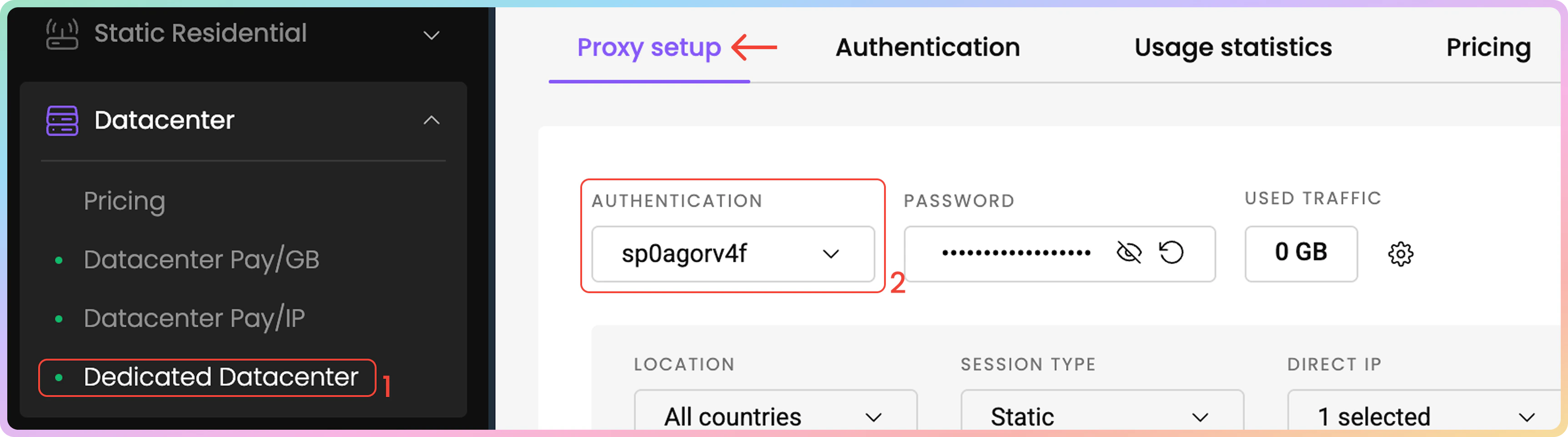 - 首先,导航到仪表板上的数据中心 → 专用数据中心 → 代理设置页面,并查找身份验证部分。