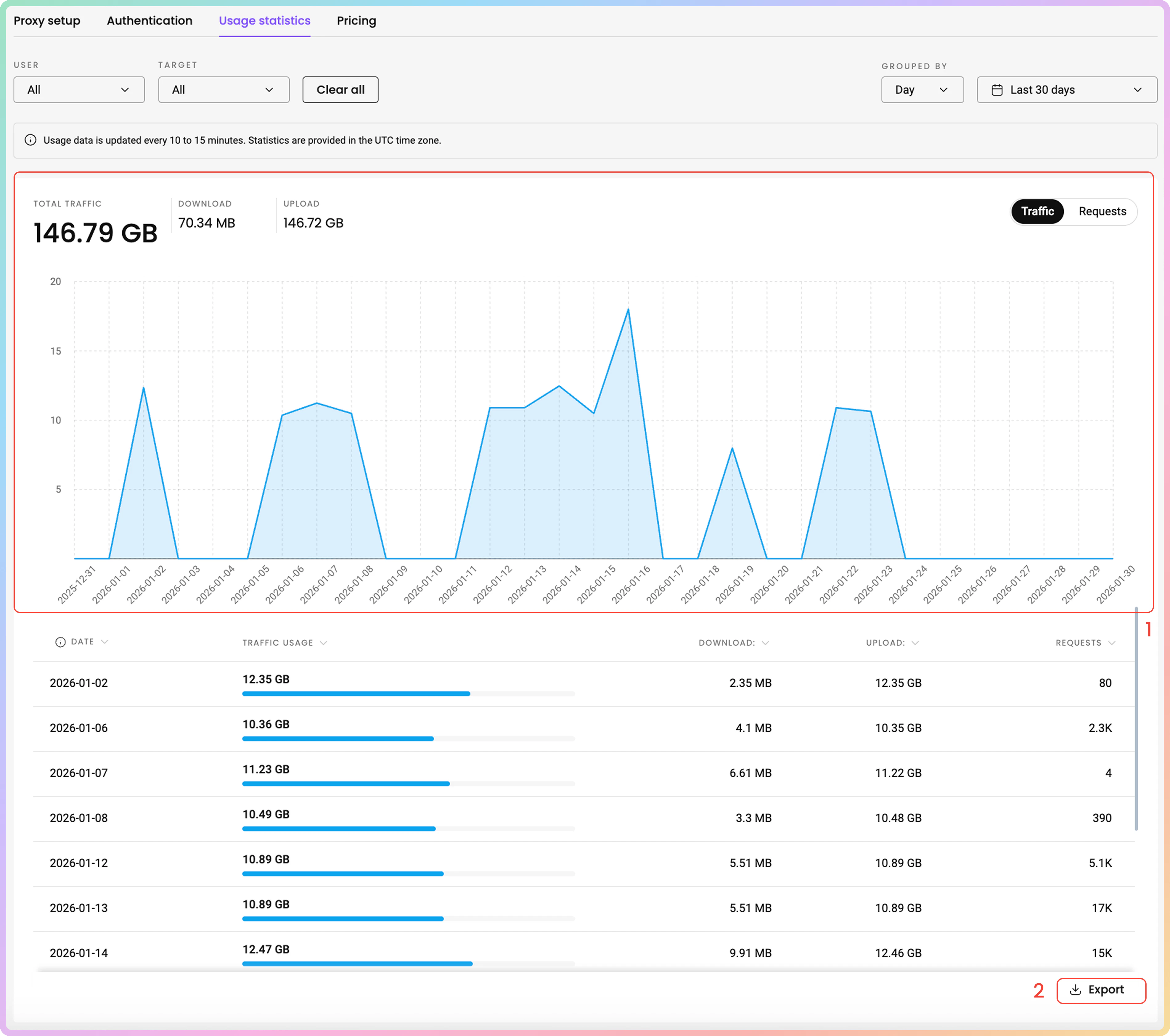 要跟踪专用 ISP 代理使用情况,请导航到数据中心 → 专用数据中心 → 代理设置部分。- 在这里,您可以查看按以下方式排序的流量或请求使用情况的图表:用户、目标,并选择时间段。