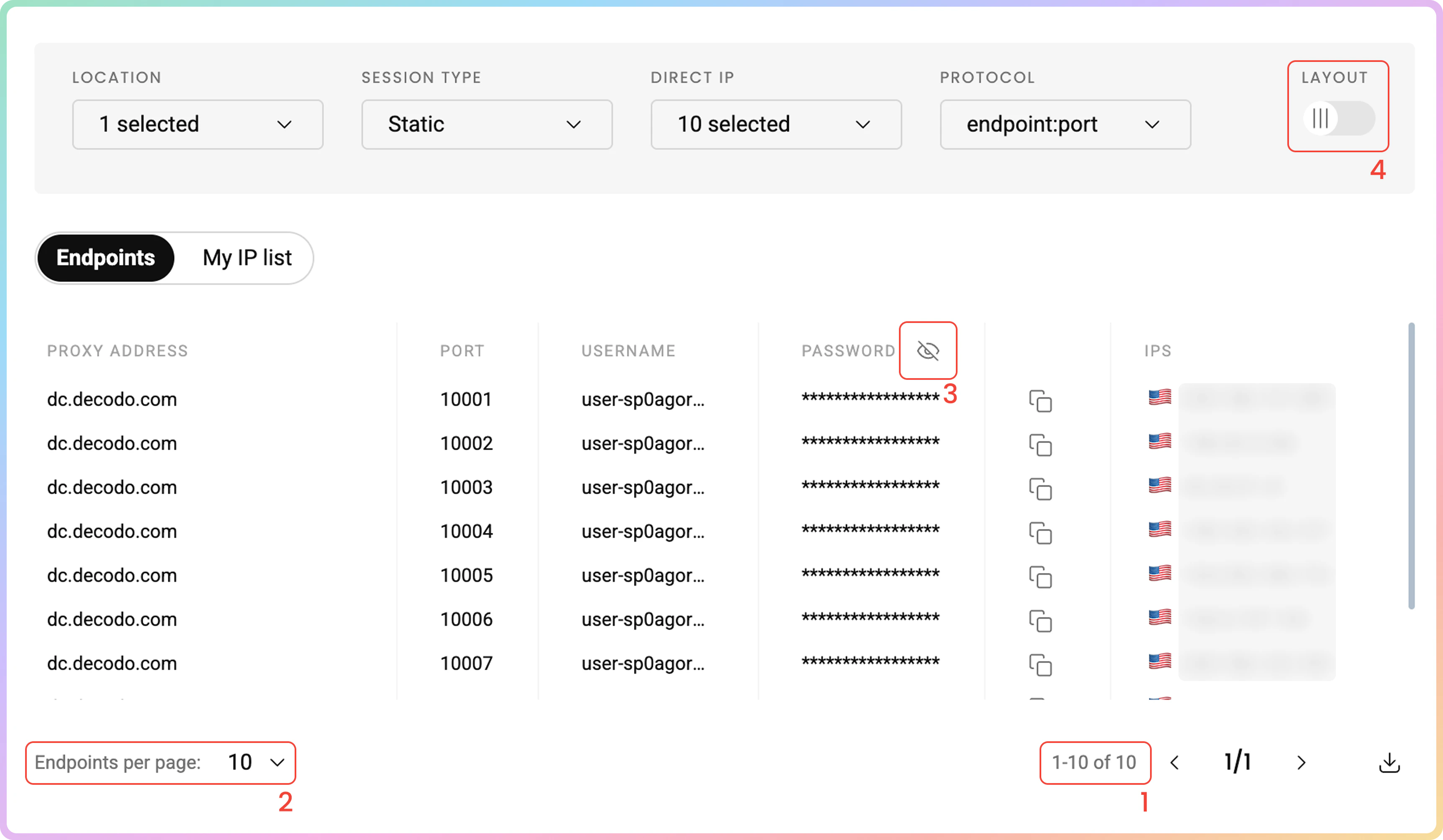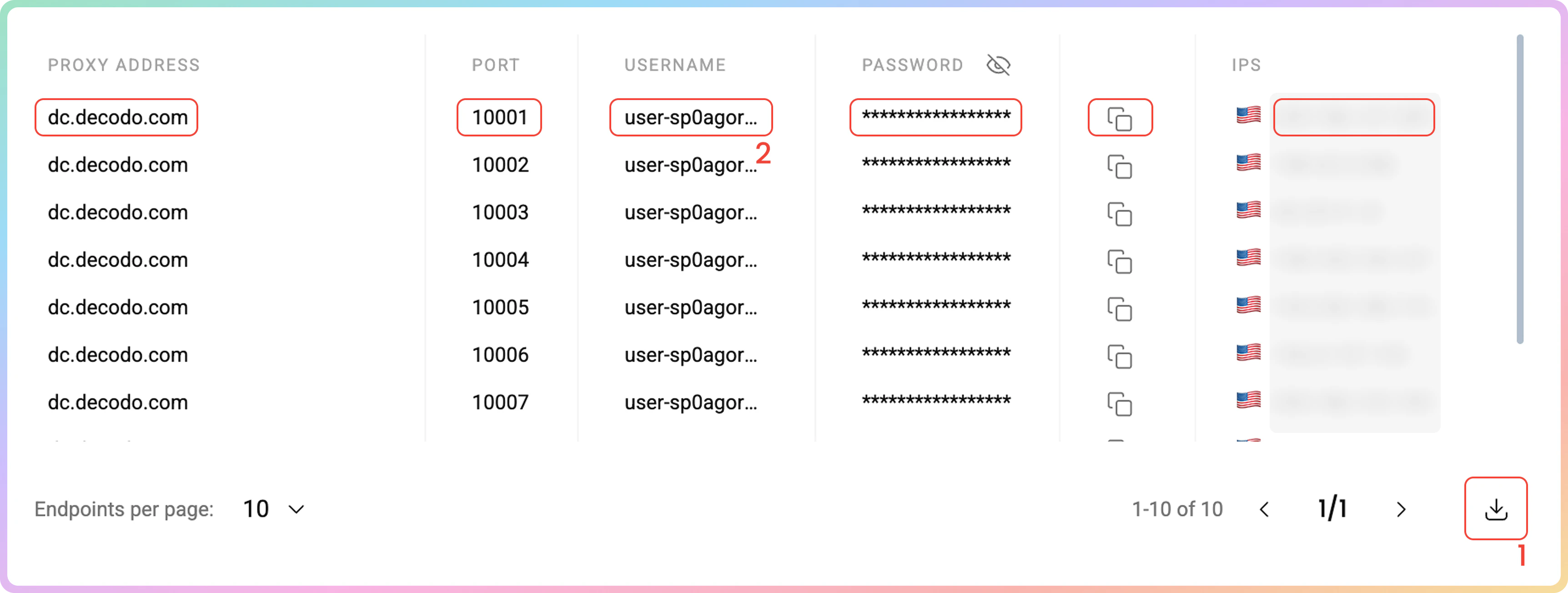 在代理设置部分完成设置后,您将看到根据您的选择生成的端点和端口的代理列表。- 只需将其复制到剪贴板,或下载创建的代理列表的