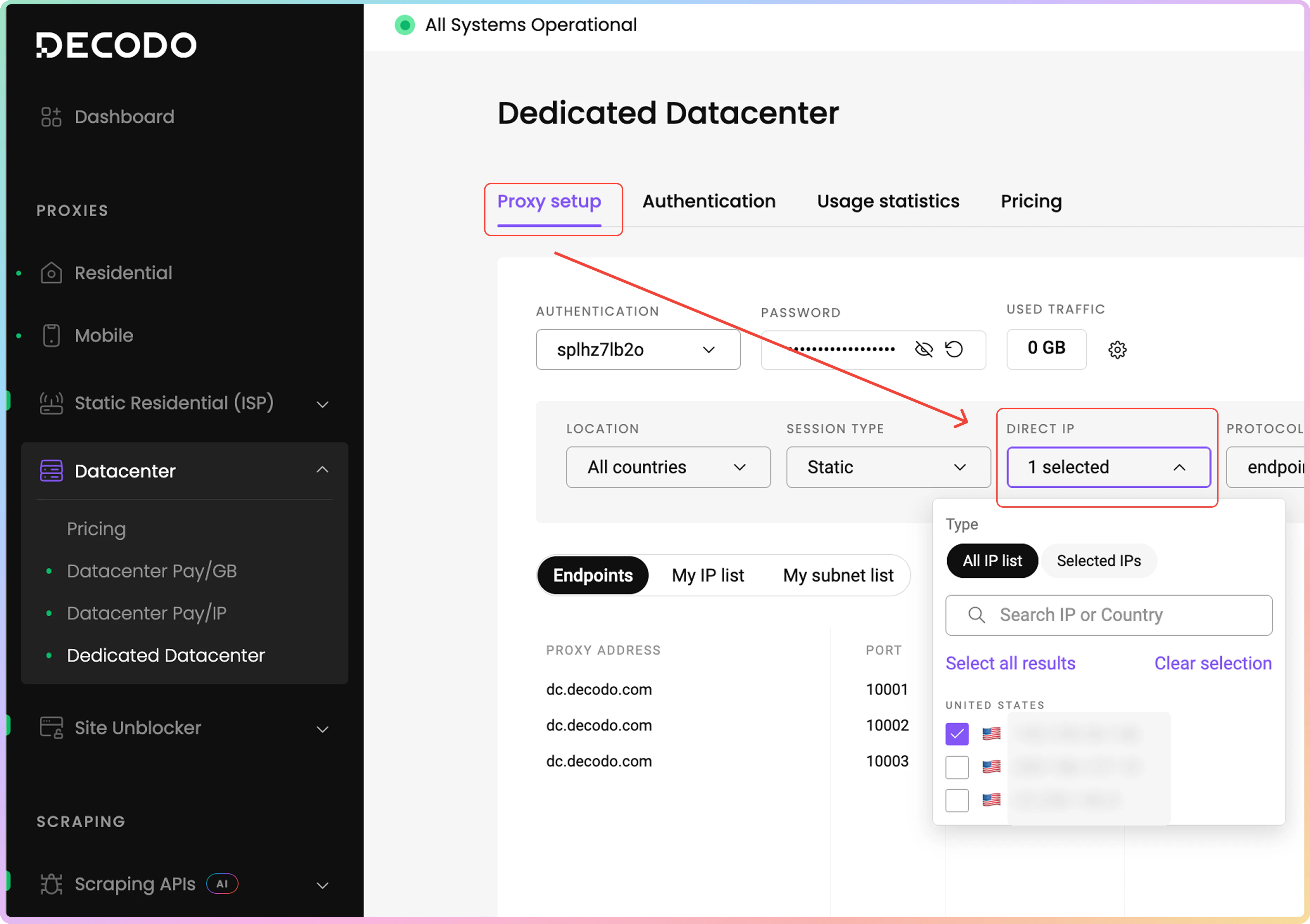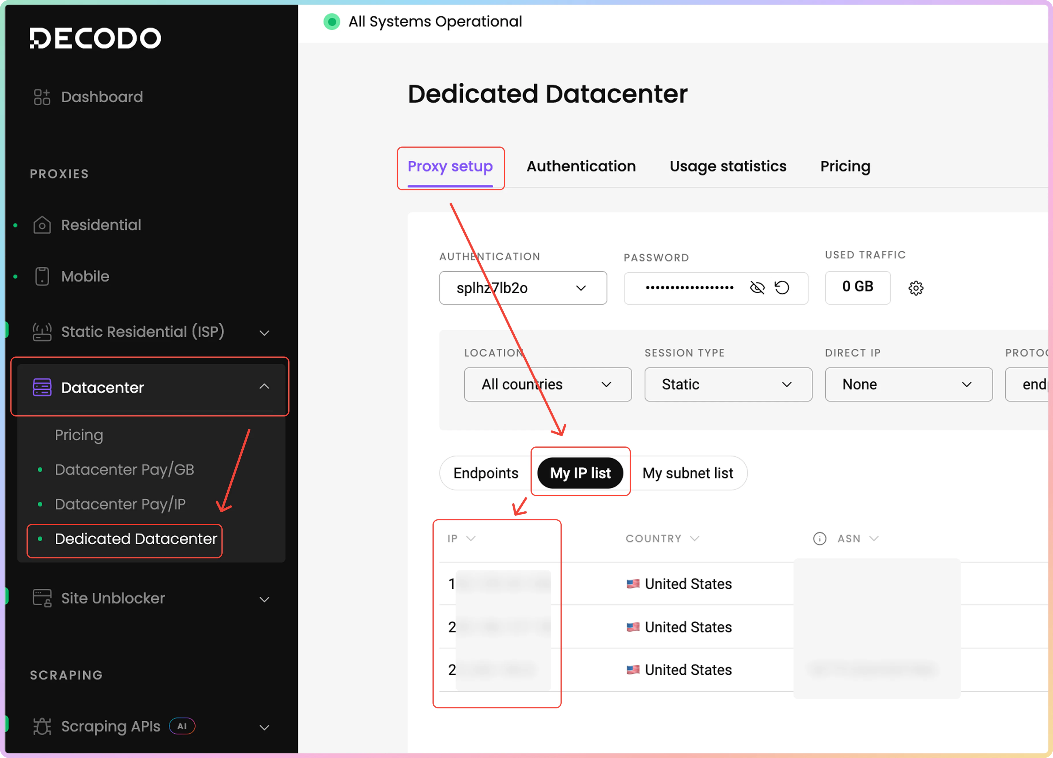 可以从您购买的代理 IP 列表中定向特定的 IP 地址。要查找您的代理 IP,请导航至 数据中心 → 专用数据中心 → 代理设置 仪表板页面。然后,点击 我的 IP 列表选项卡。在下面的表格中,您将找到您购买的 IP 地址、它们的原产国家和 ASN。请记住,列出的某些 IP 可能没有关联的 ASN。