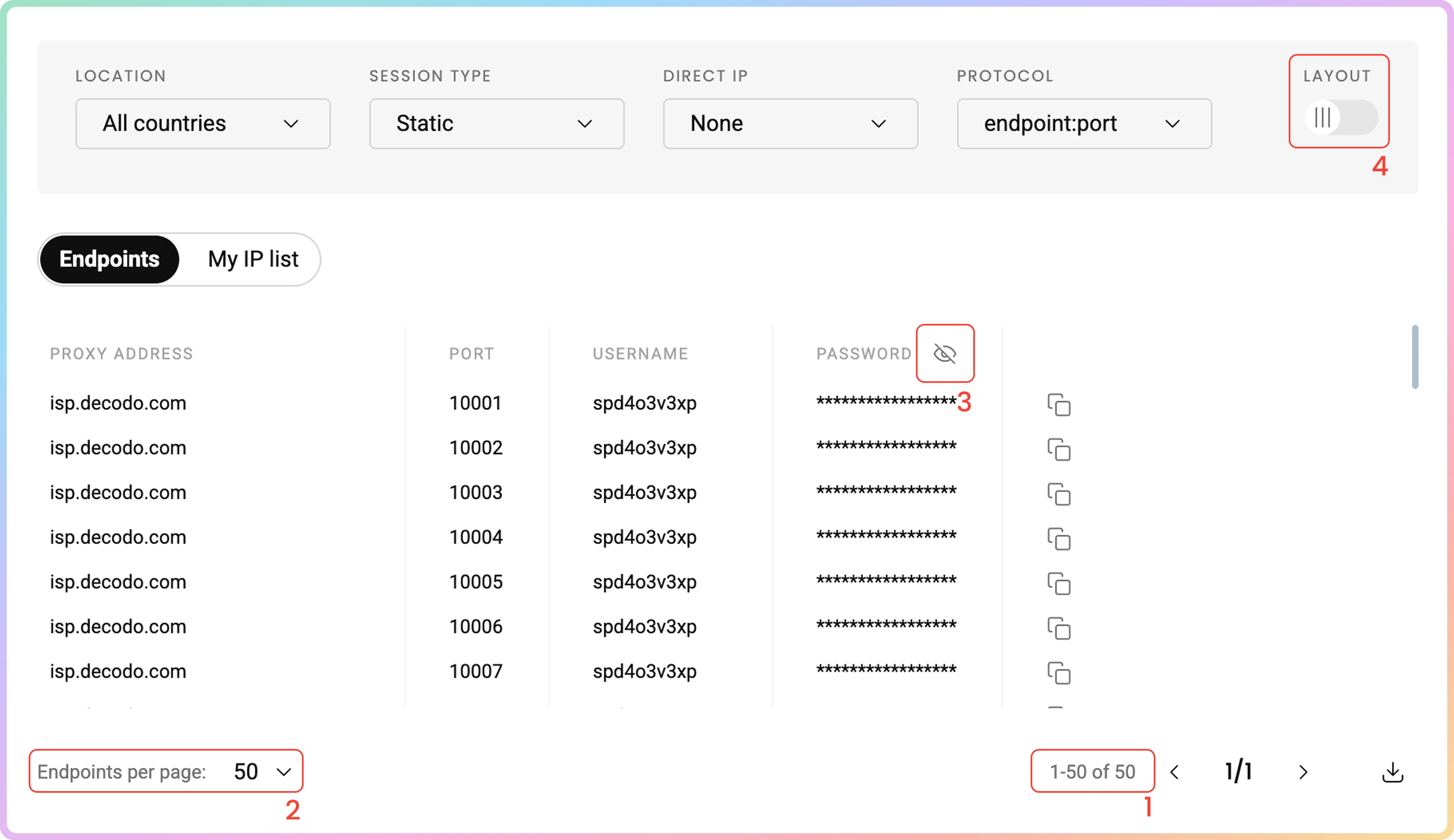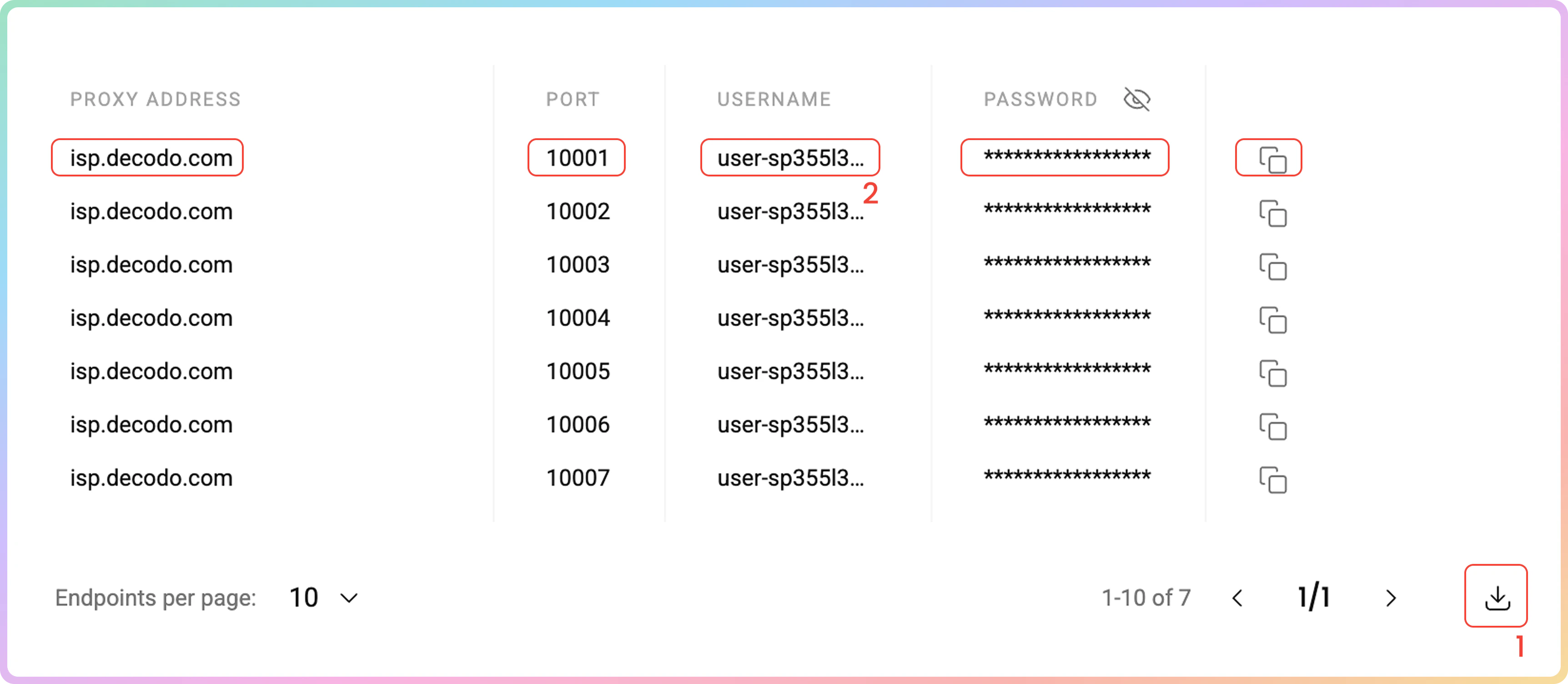 在代理设置部分完成设置后,您将看到根据您的选择生成的端点和端口的代理列表。- 只需将其复制到剪贴板,或下载创建的代理列表的
