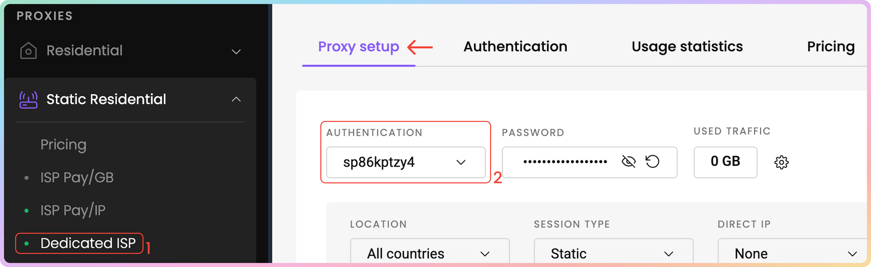- 首先,导航到仪表板上的静态住宅 → 专用ISP → 代理设置页面,并查找身份验证部分。