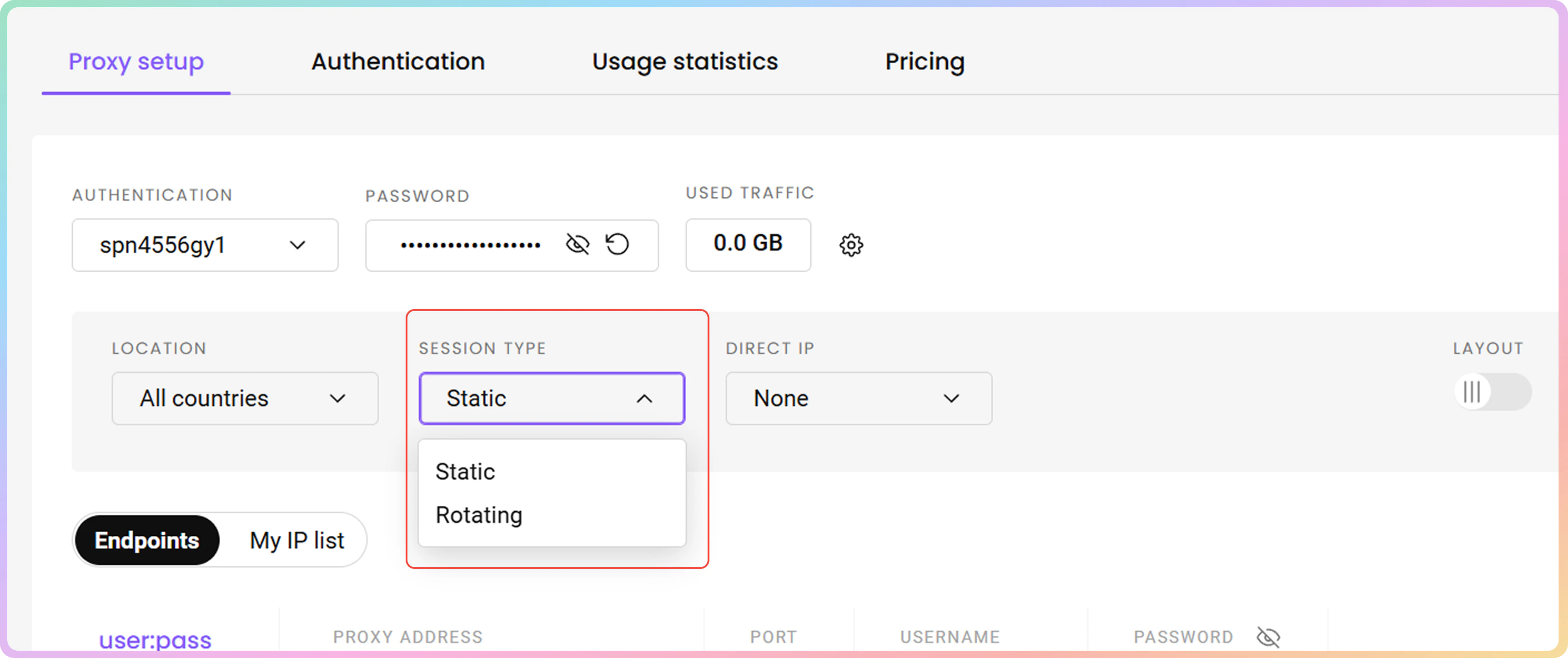 端口**10000**在您发出的每个请求上轮换IP,并将从您购买的IP列表中选择IP。