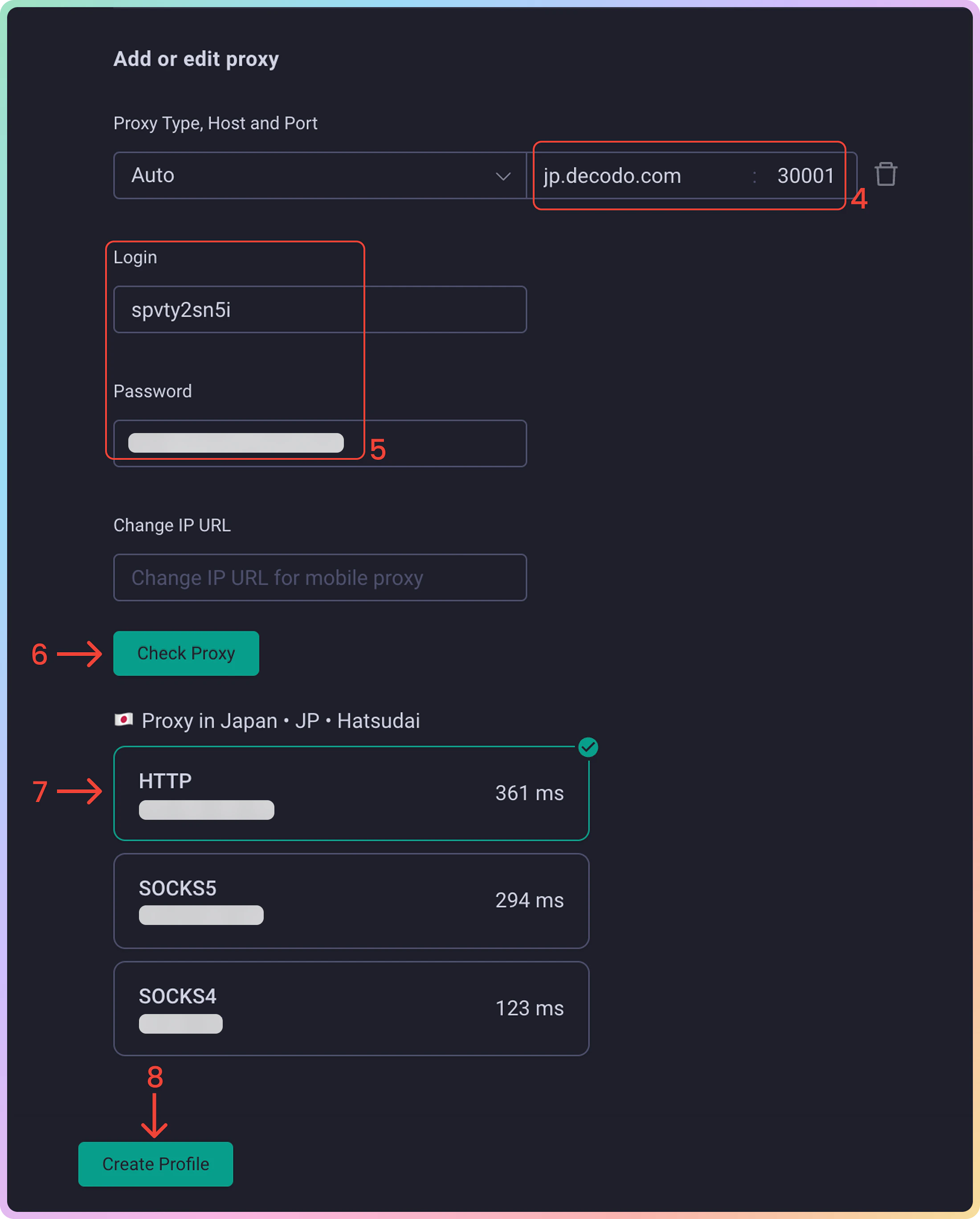 • 代理端点端口(例如,us.decodo.com:10101)。
