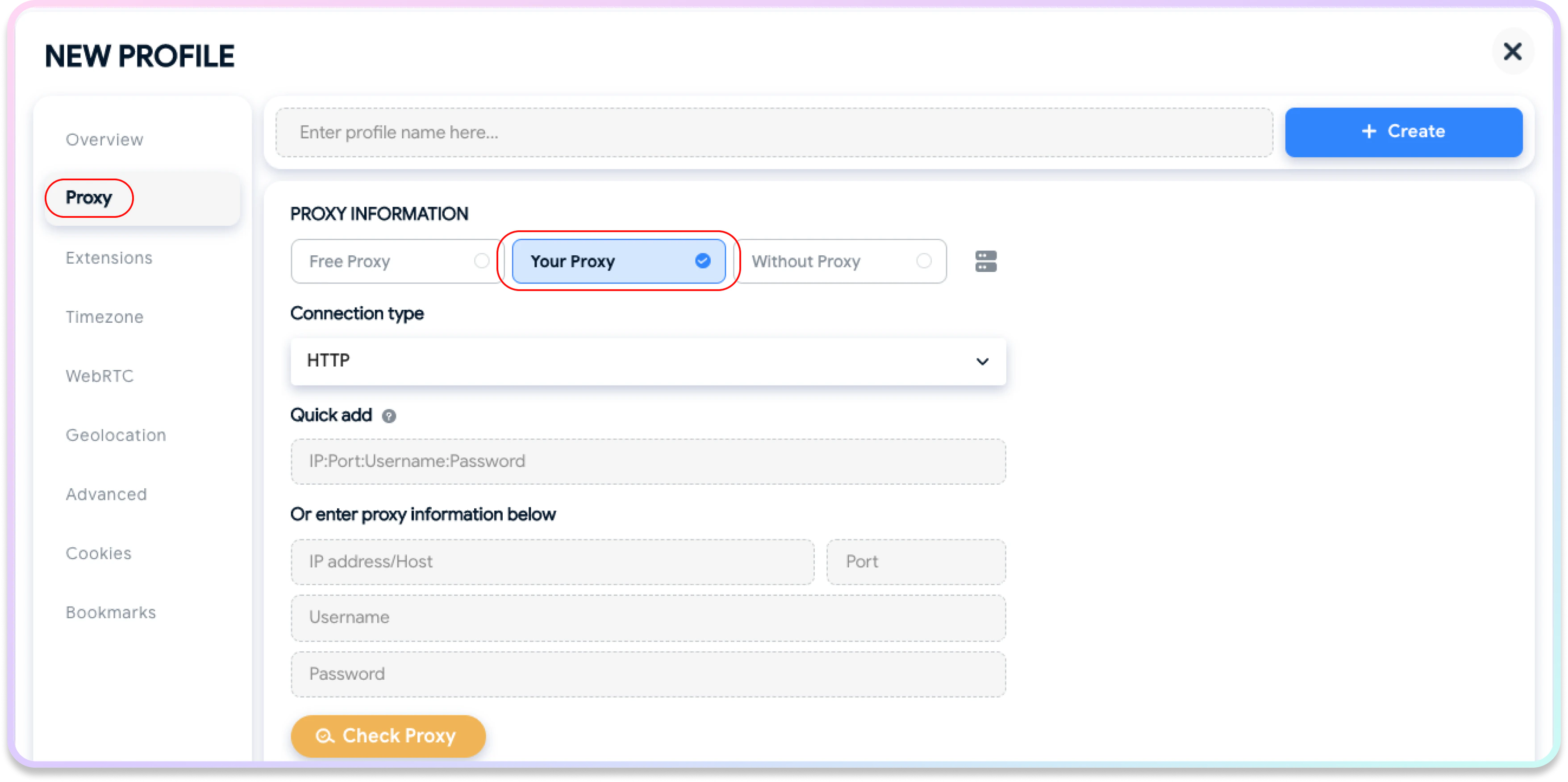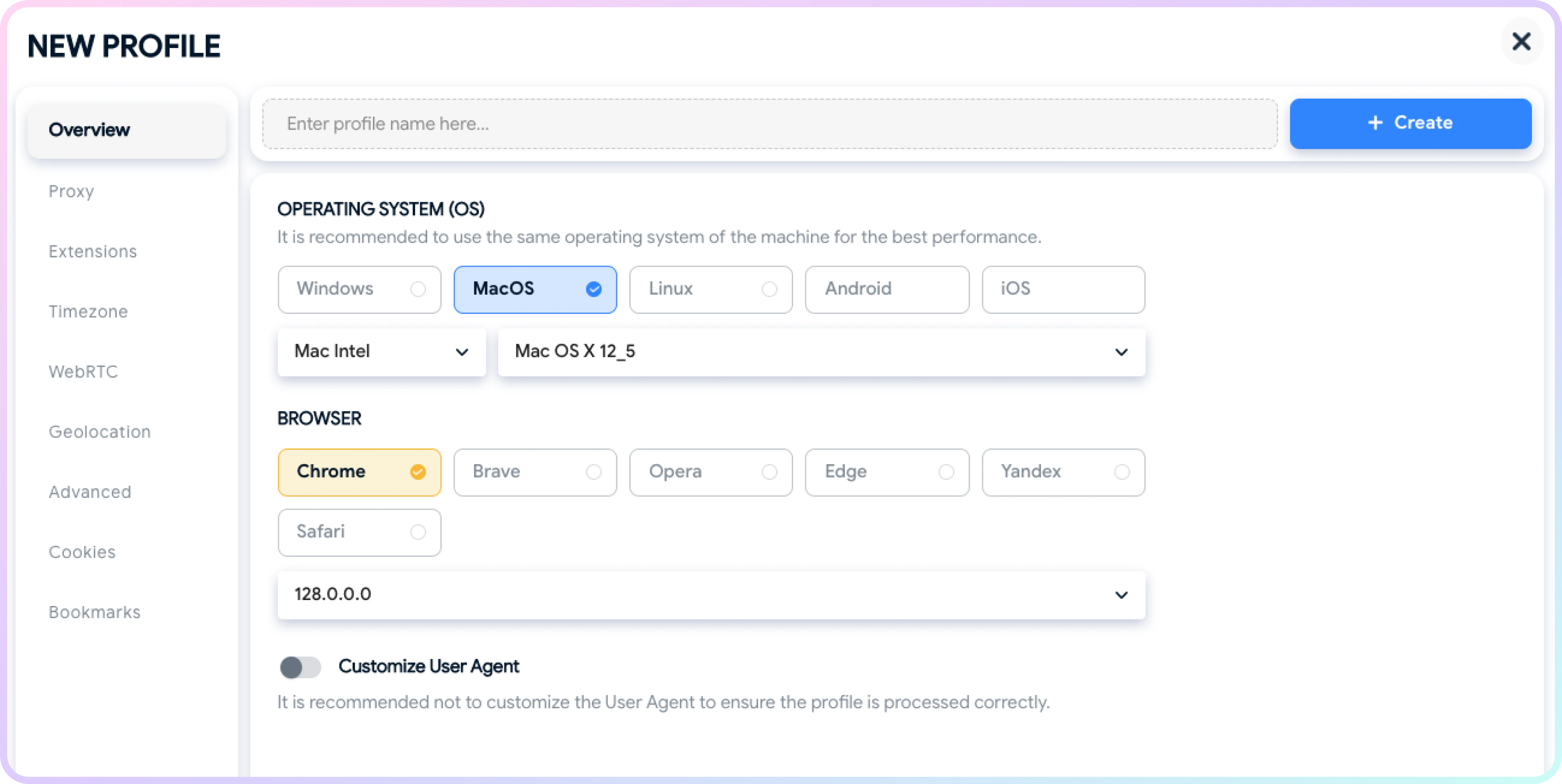 代理密码 - 您可以进入高级选项并根据需要自定义浏览器指纹。