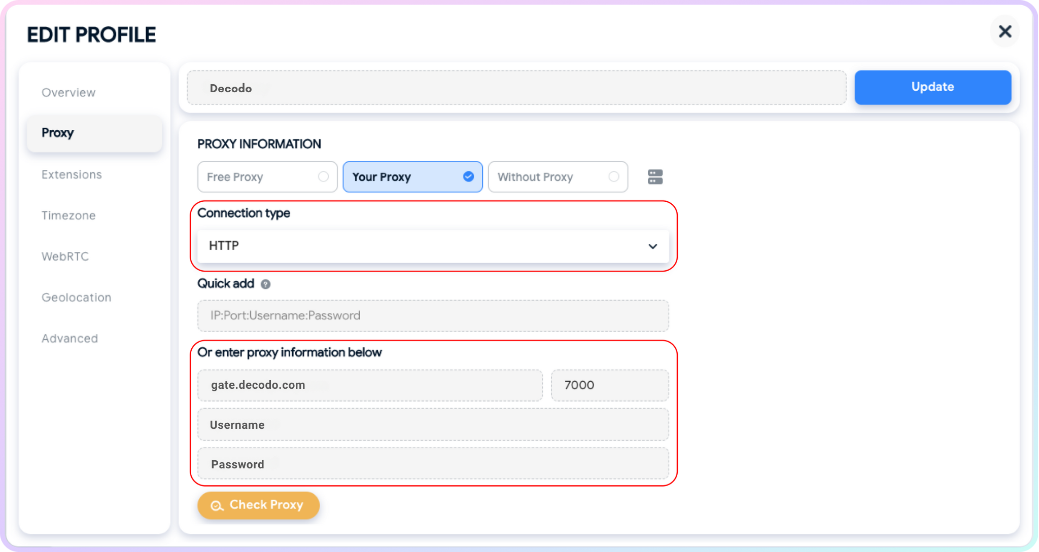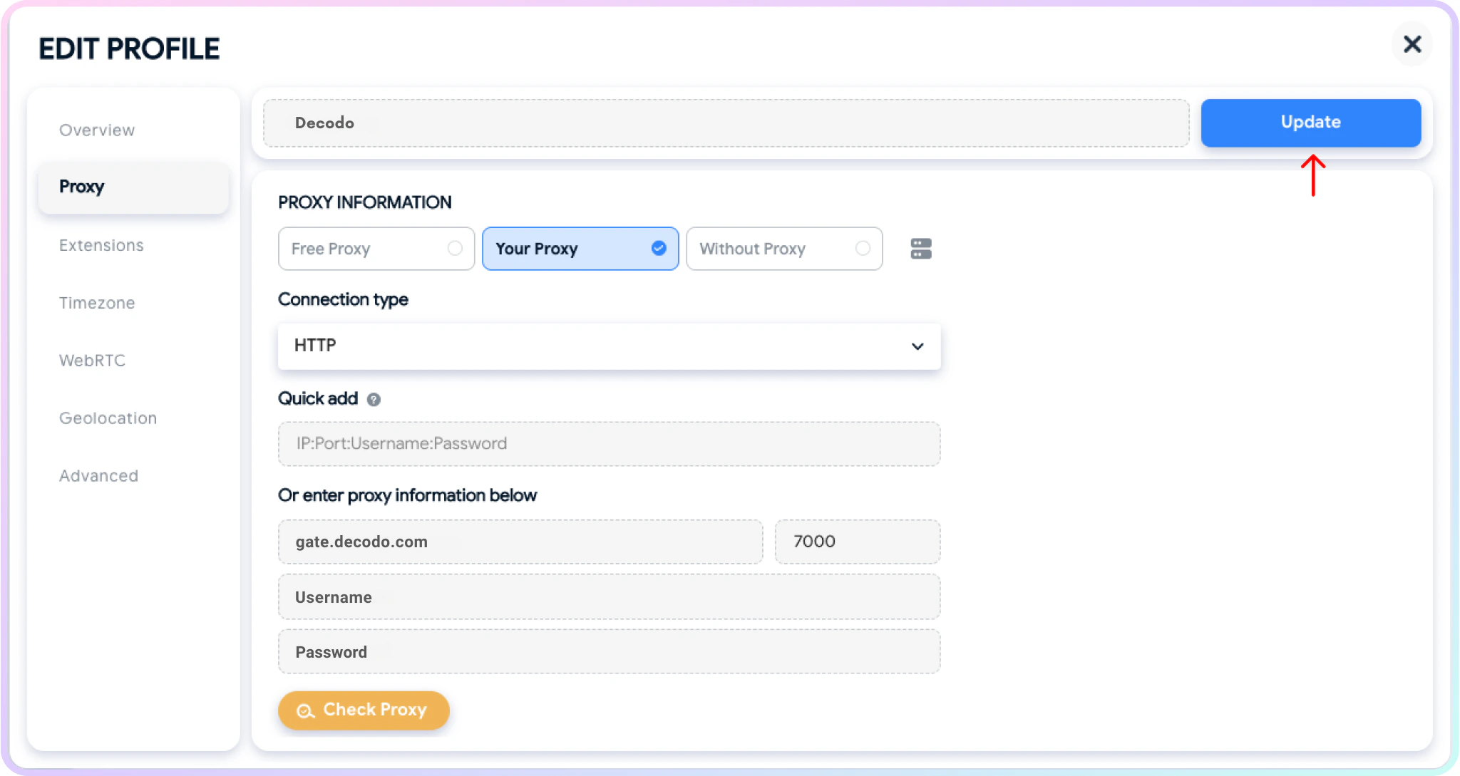 HTTP、HTTPS 或 SOCKS5,如果您的订阅支持)。将代理详细信息/端点输入到正确的字段中。输入后,您可以通过点击检查代理来仔细检查代理是否正常工作。以下是住宅代理的示例:- 端点: