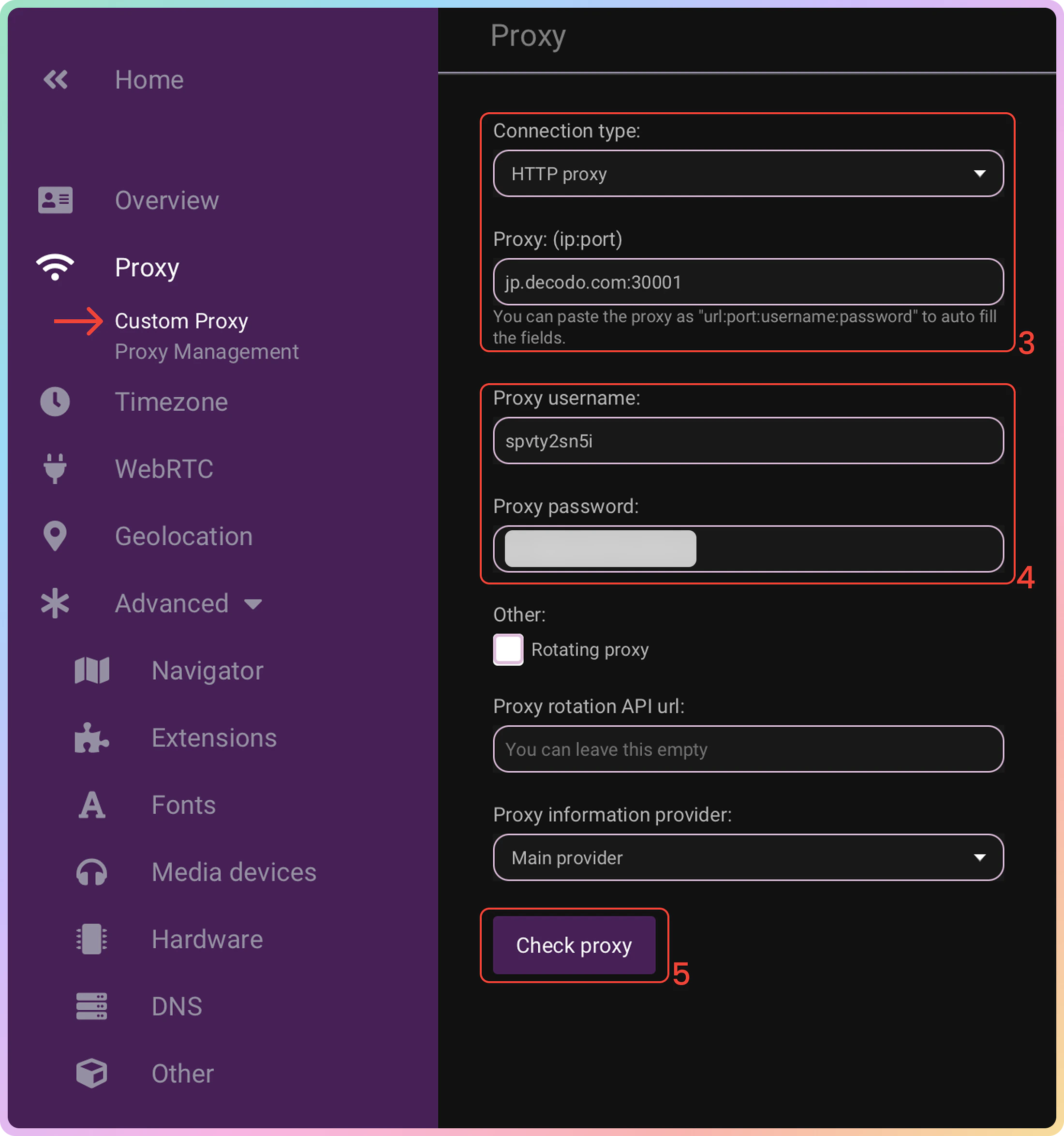 us.decodo.com:10101)。 - 您的代理用户名和密码(或已设置白名单 IP)。