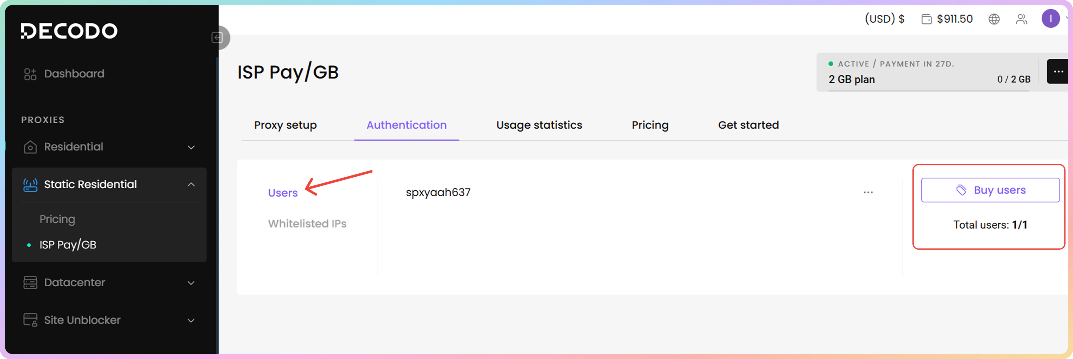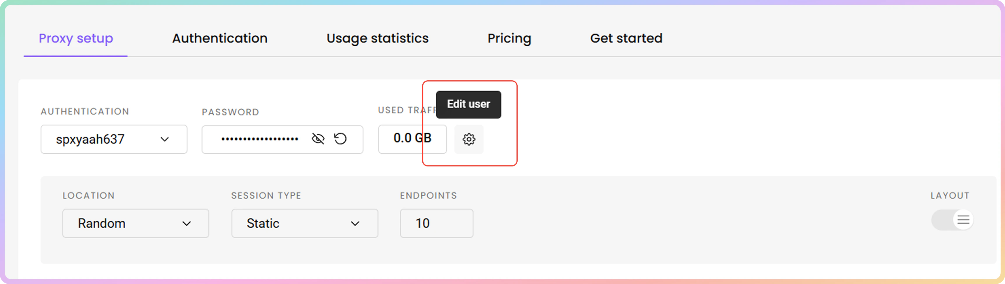 - 购买订阅后,代理用户名和密码将自动在身份验证部分生成。