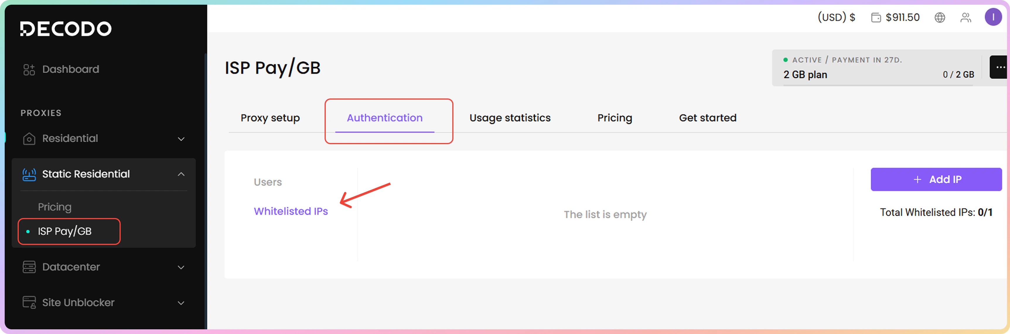 - 您可以通过点击身份验证部分的白名单 IP 选项卡来管理您的白名单 IP。