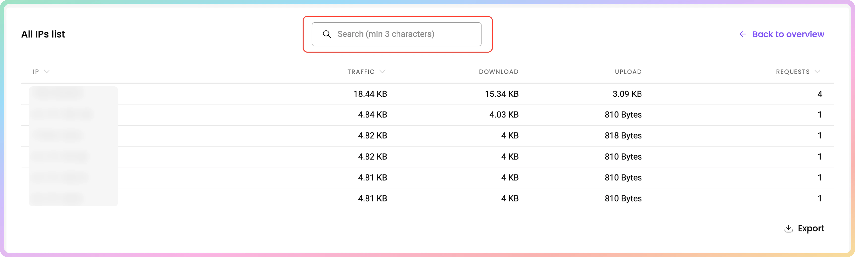 在热门IP表中,您可以看到您定位的代理IP,按总流量消耗降序排列。- 您可以找到编号、IP、流量和请求列。