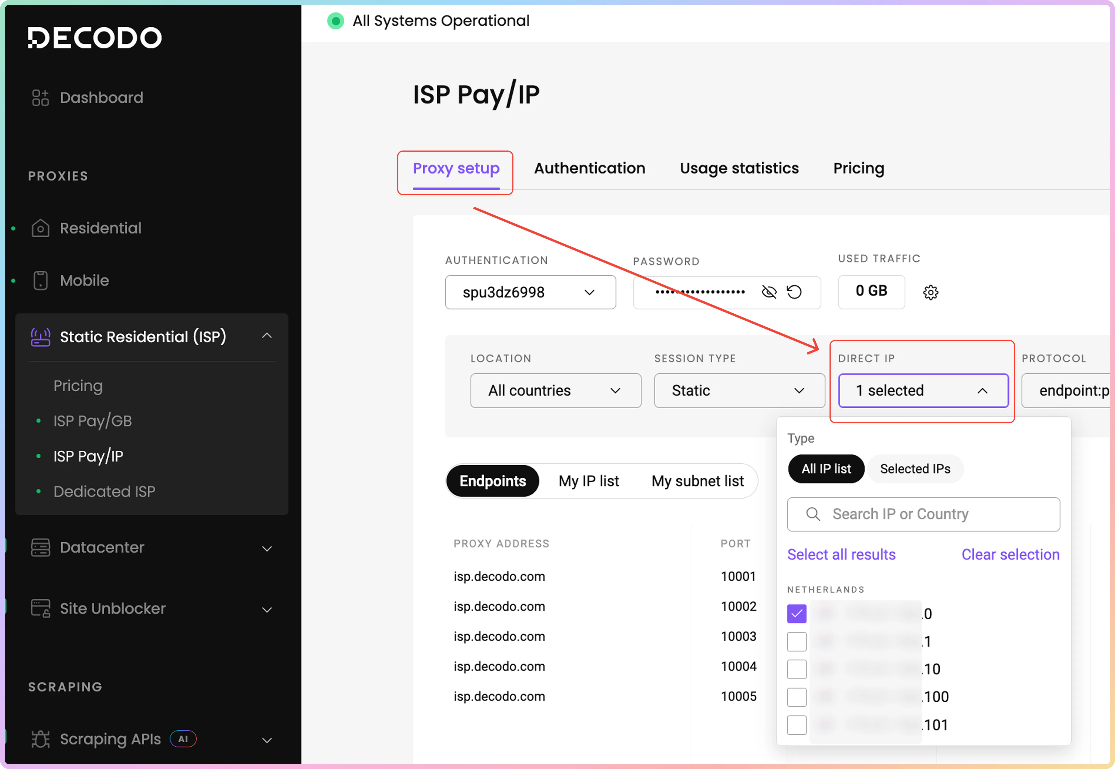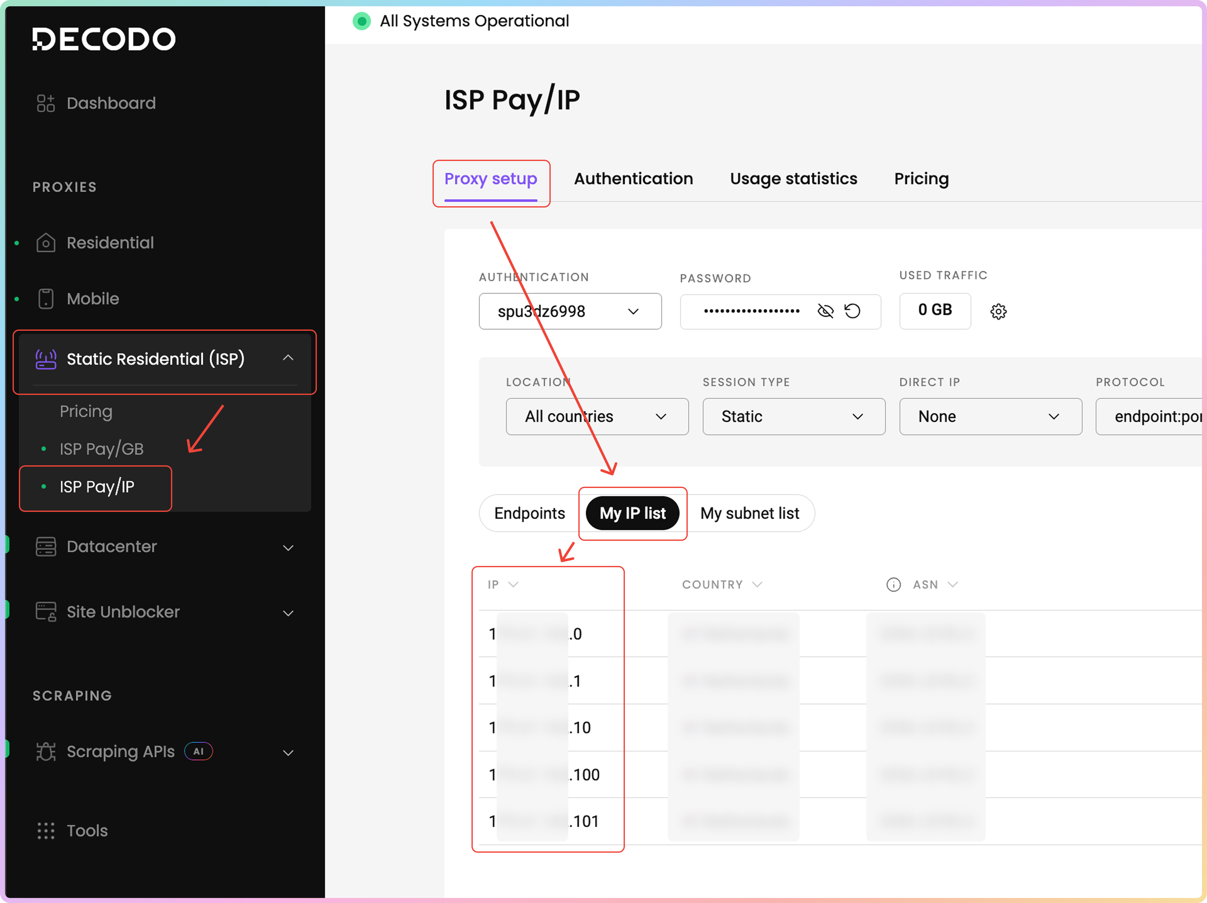 可以从您购买的代理IP列表中将特定IP地址作为参数进行定位。要查找您的代理IP,请导航到静态住宅 → ISP按IP付费 → 代理设置仪表板页面。然后,点击我的IP列表选项卡。在下面的表格中,您将找到您购买的IP地址、它们的原产国家和ASN。请记住,列出的某些IP可能没有关联的ASN。