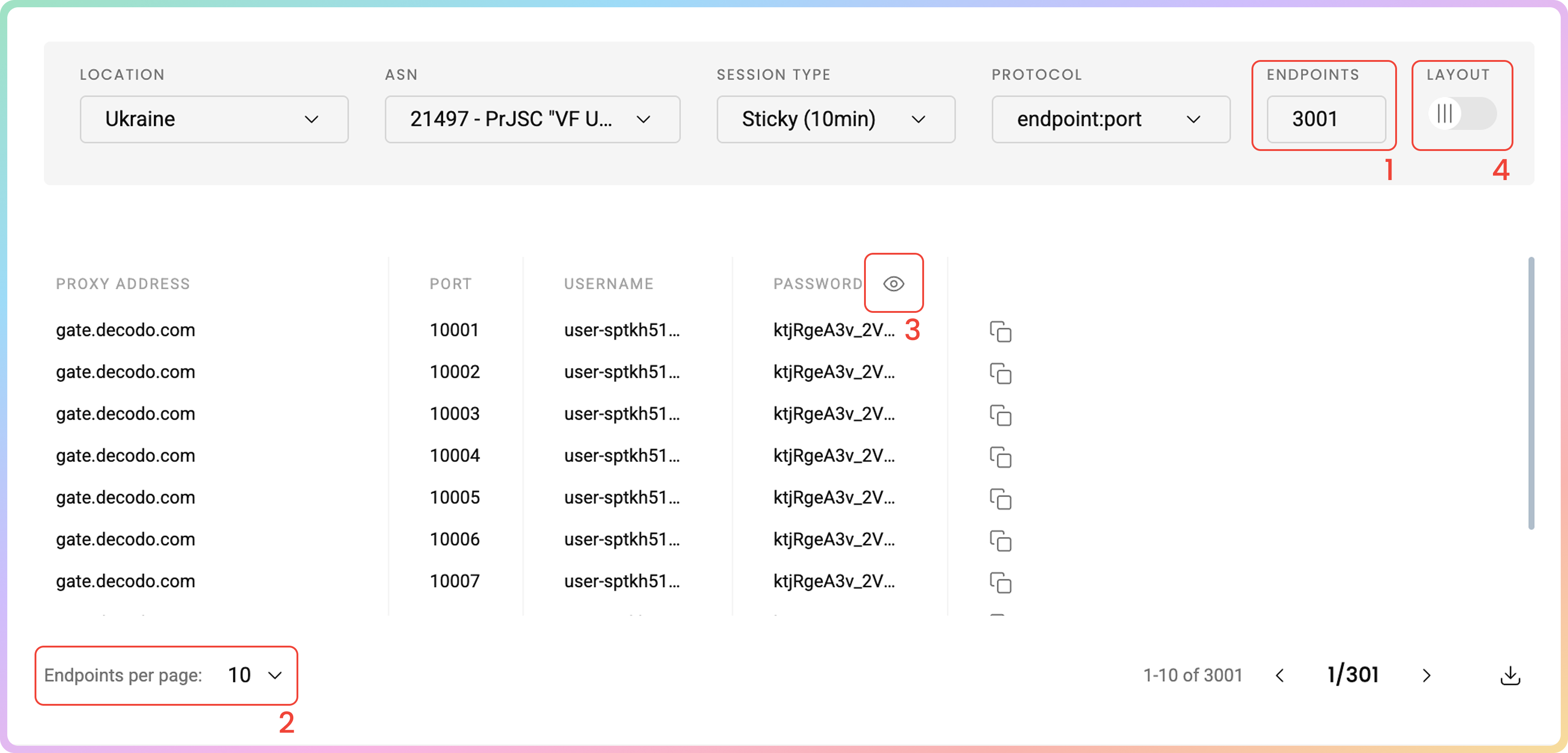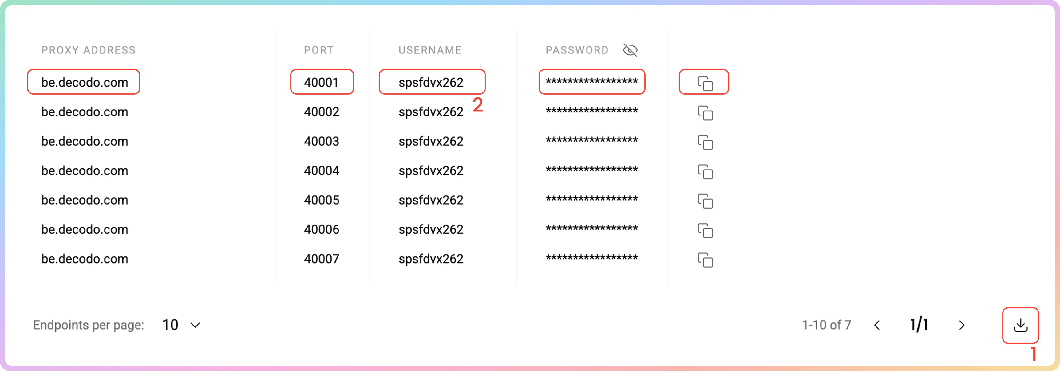 在代理设置部分完成设置后,您将看到根据您的选择生成的端点和端口的代理列表。- 只需将其复制到剪贴板,或下载创建的代理列表的
