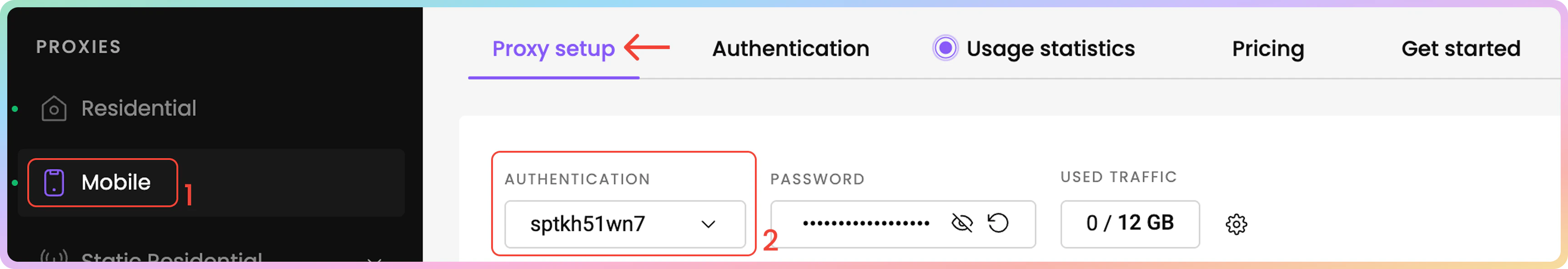 在仪表板的移动代理设置部分,选择各种参数将生成您可以轻松复制到应用程序、工具或代码中的示例。- 在住宅 → 移动 → 代理设置页面上,在身份验证方法下方找到参数选择部分。