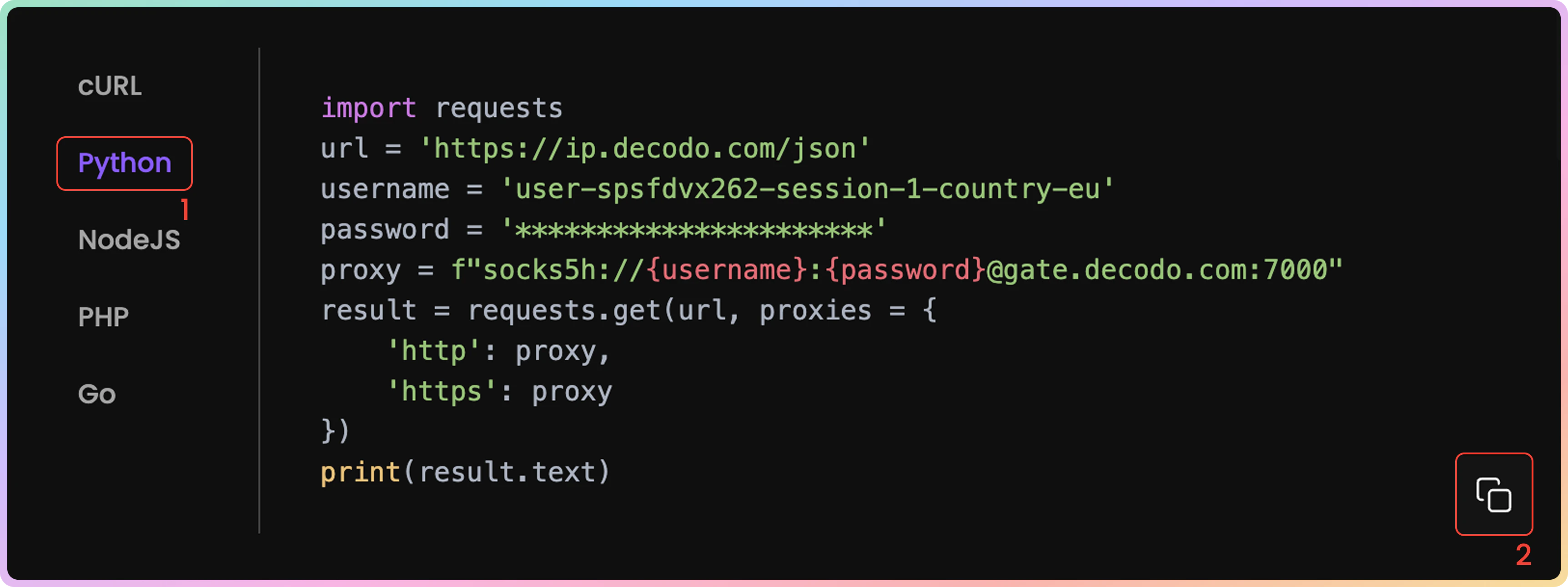 cURL、Python、NodeJS、PHP或GO。 - 通过单击右下角的复制来复制预配置的代码示例。