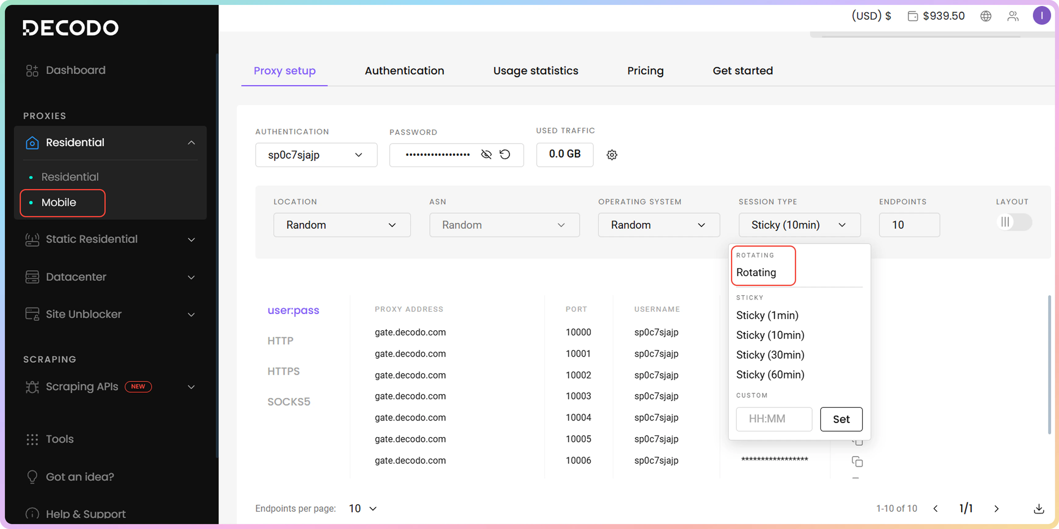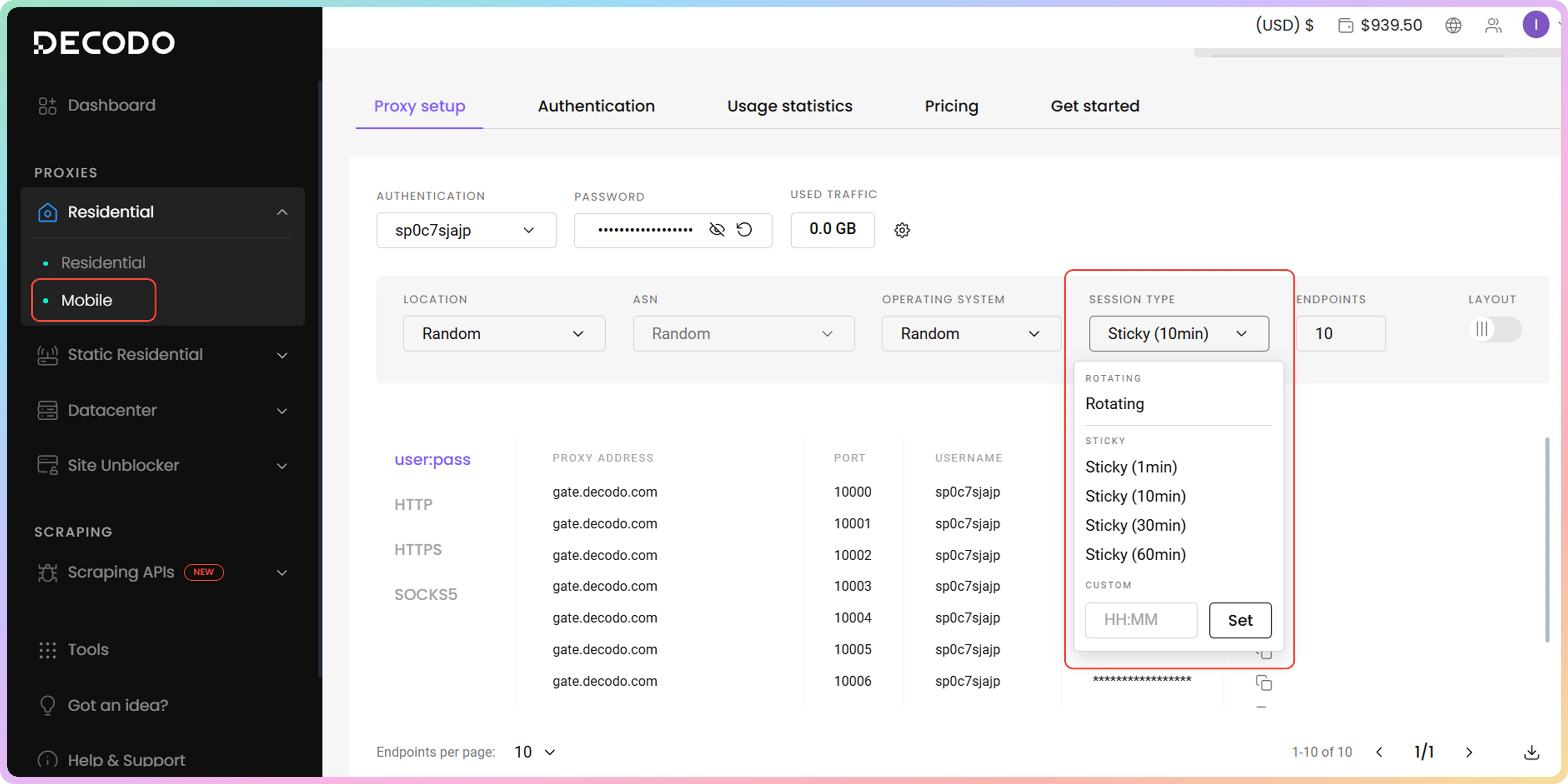 要选择粘性会话类型,请导航至代理设置部分并使用下拉菜单。 一旦您与粘性端口建立第一次连接,IP地址将在指定的持续时间内保持不变,无论发出多少请求。移动端点在仪表板下拉菜单中有四个选项:1、10、30或60分钟。您还可以手动指定最长24小时的自定义持续时间。