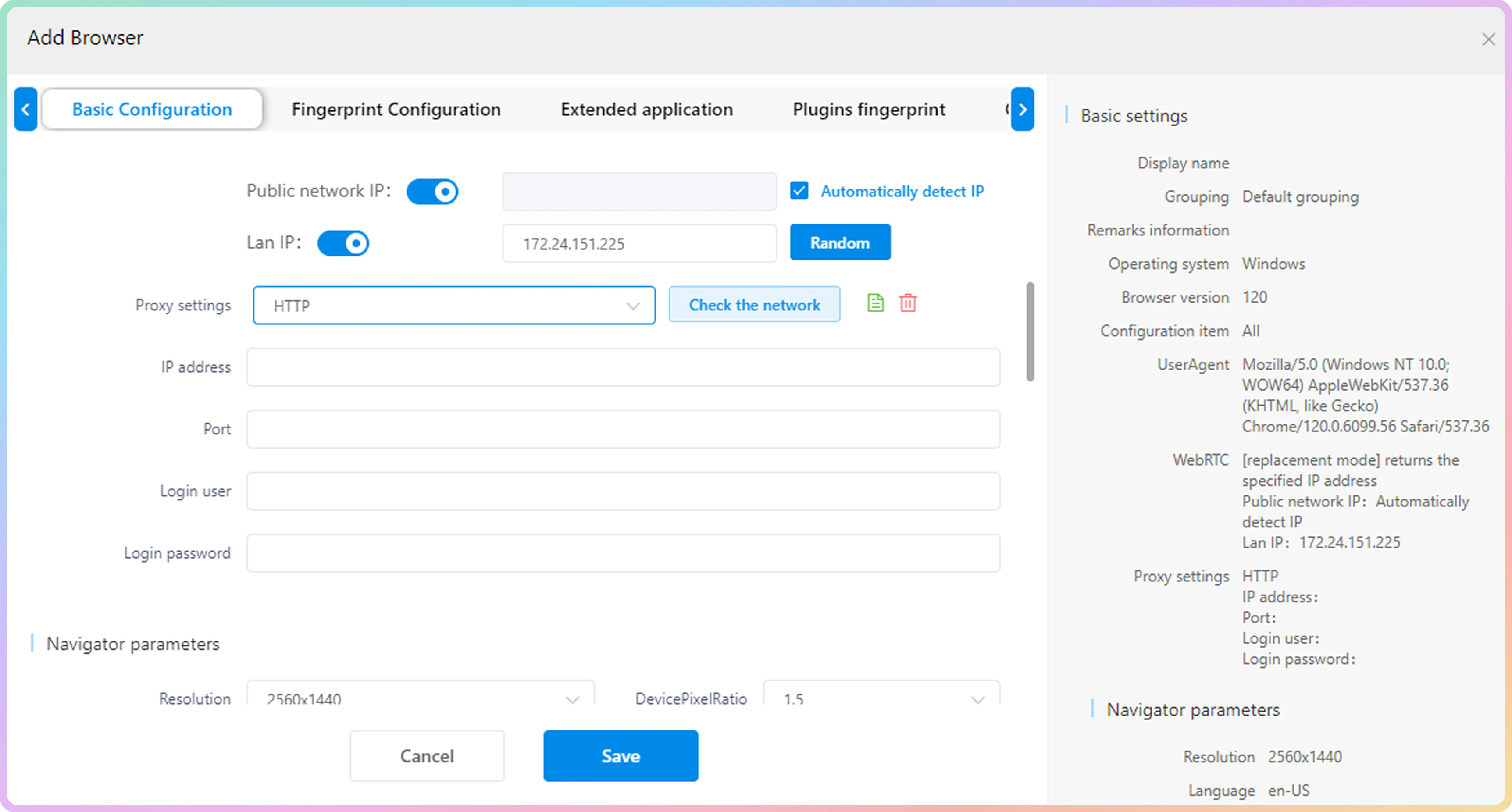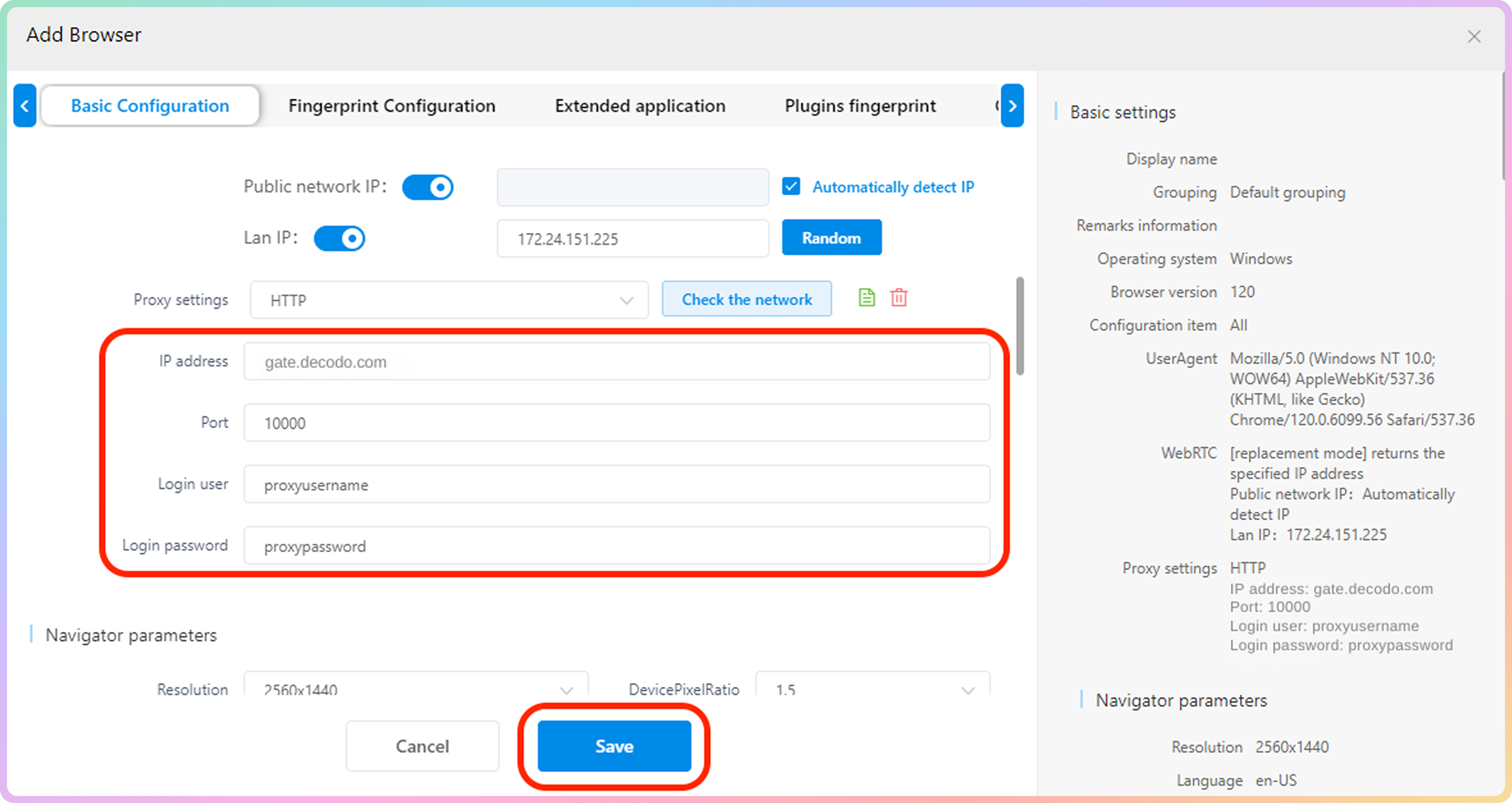 填写 IP 地址、端口、登录用户和登录密码的文本字段。以下是住宅代理的示例: