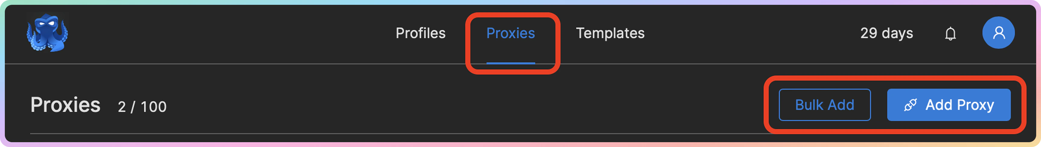 您可以在 Octo Browser 中单独创建和链接代理和浏览器配置文件,并按您认为方便的任何顺序进行。例如,您可以通过点击 Add Proxy(添加代理)或 Bulk Add(批量添加)按钮在 Proxies(代理)部分添加代理,然后稍后将它们分配给特定配置文件。
