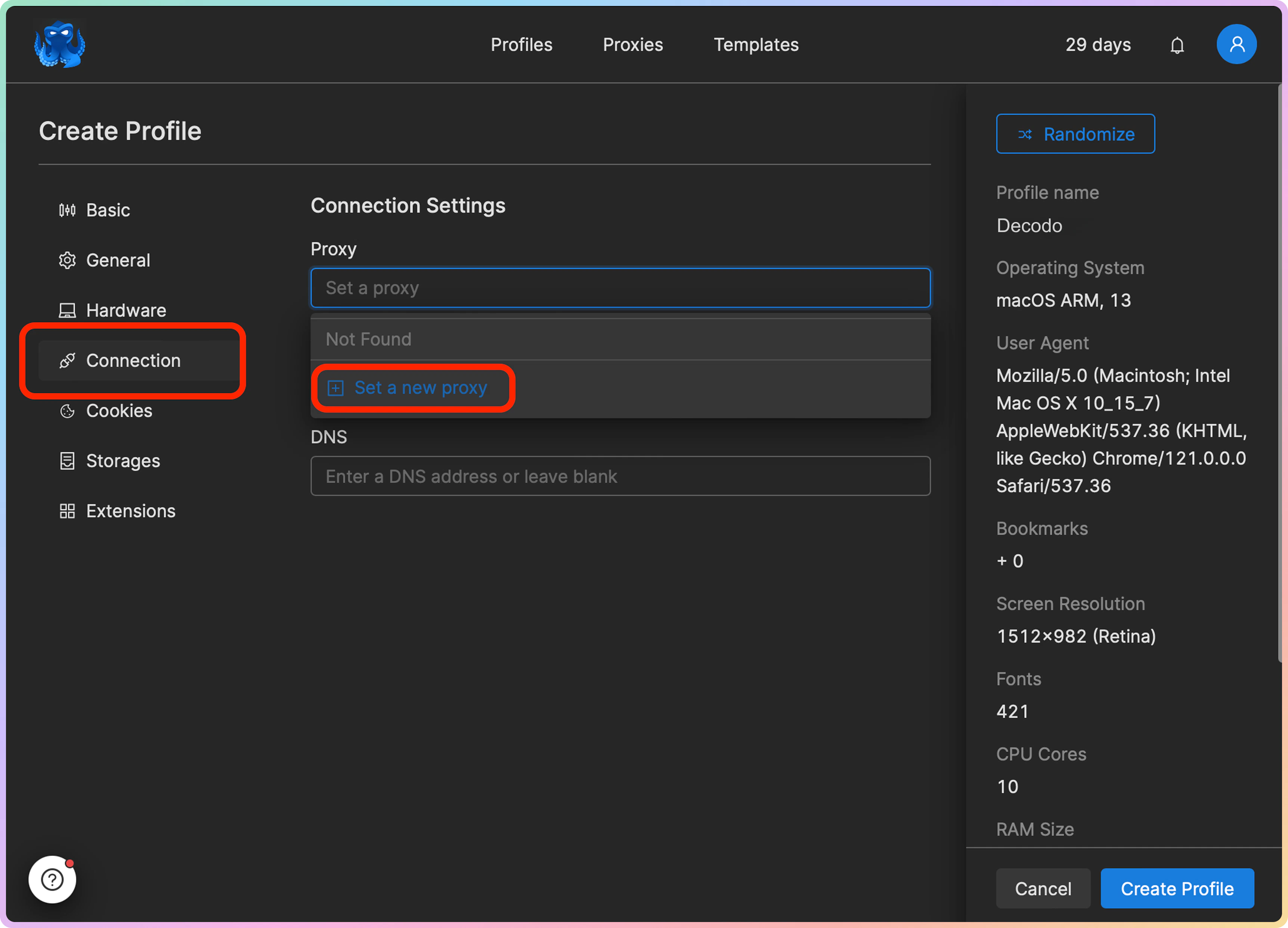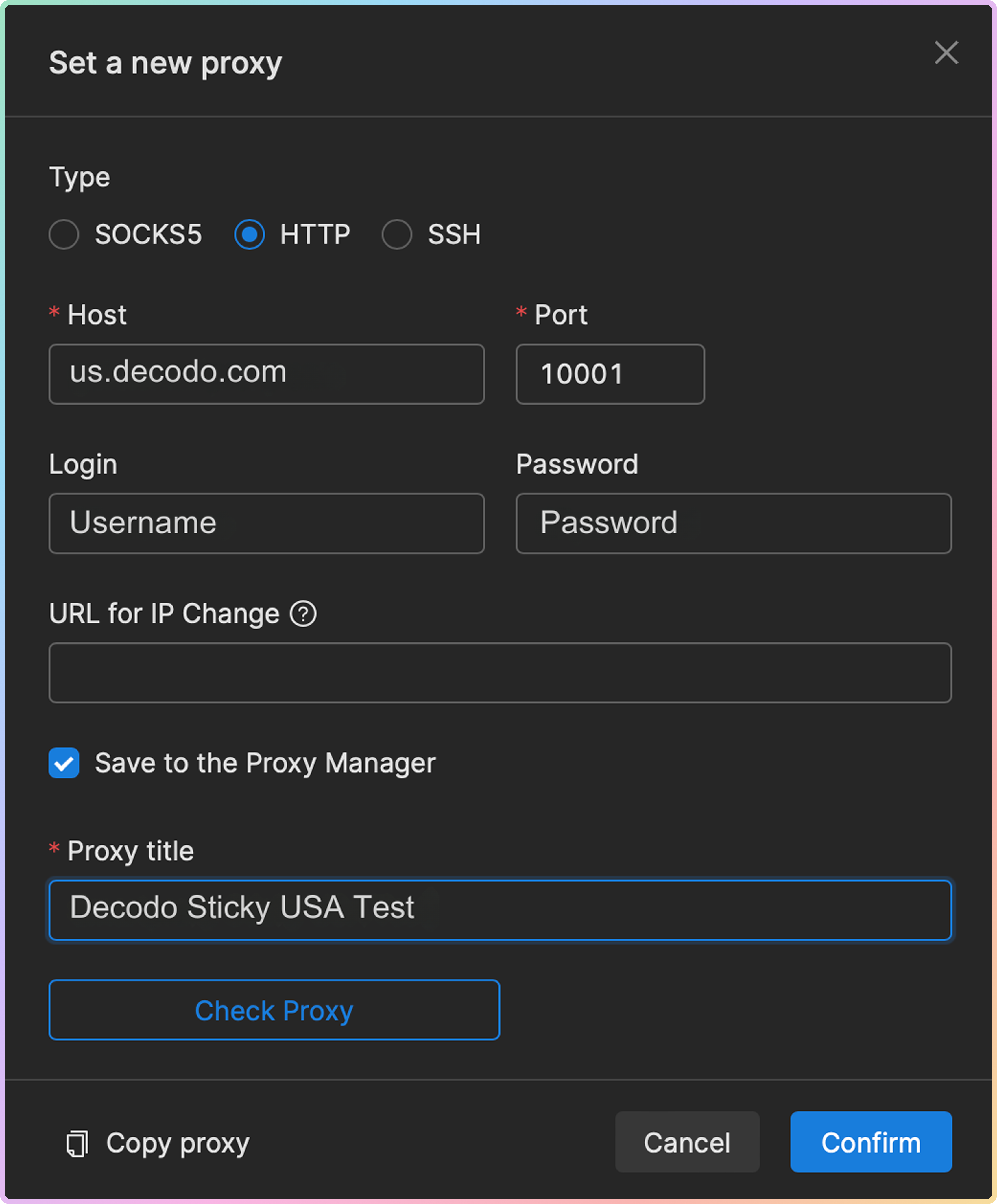 在 Set a new proxy(设置新代理)弹出窗口中,选择代理类型并输入代理详细信息,这些信息可以在您的 Decodo 仪表板上找到。以下是住宅代理的示例: