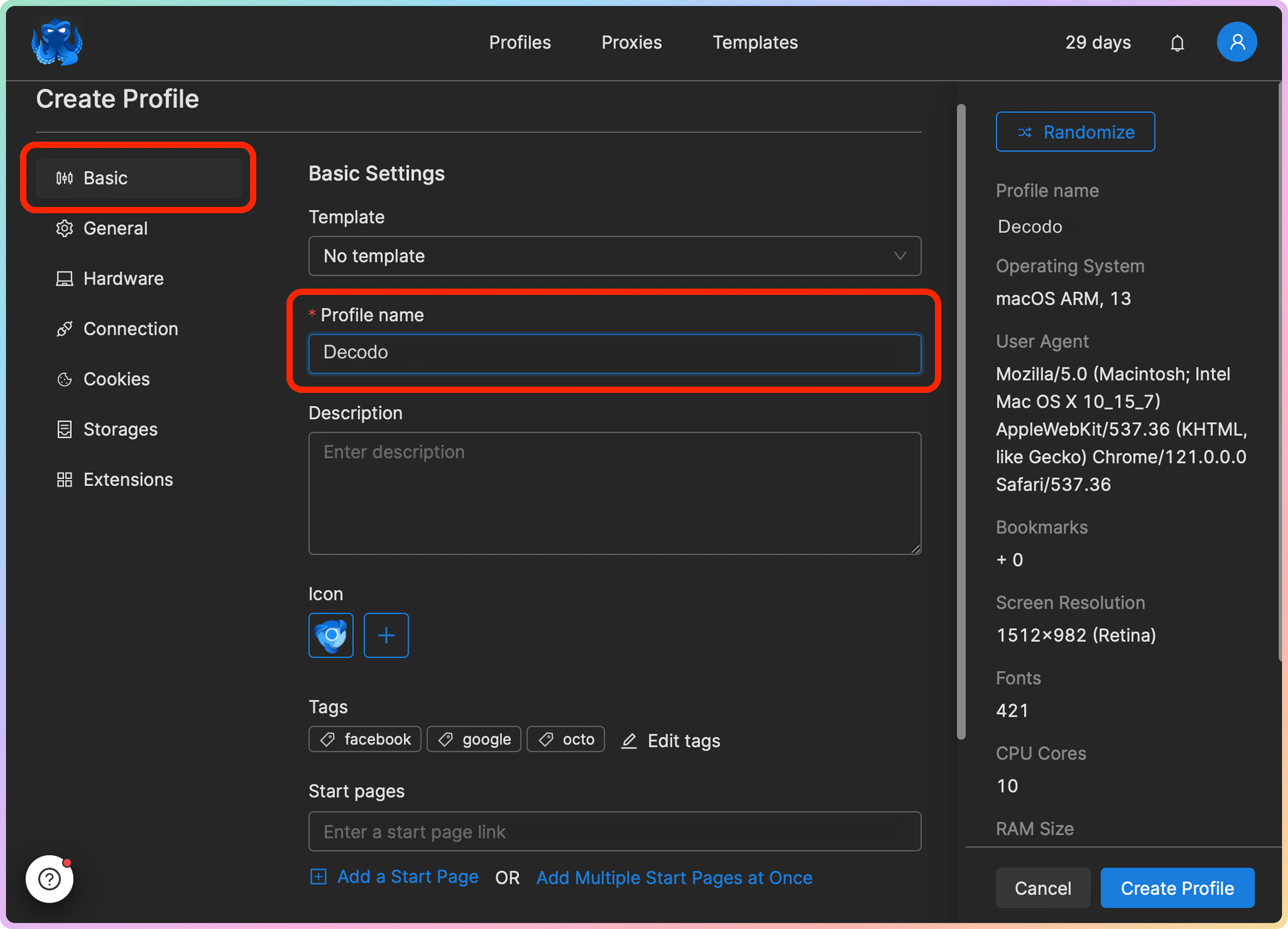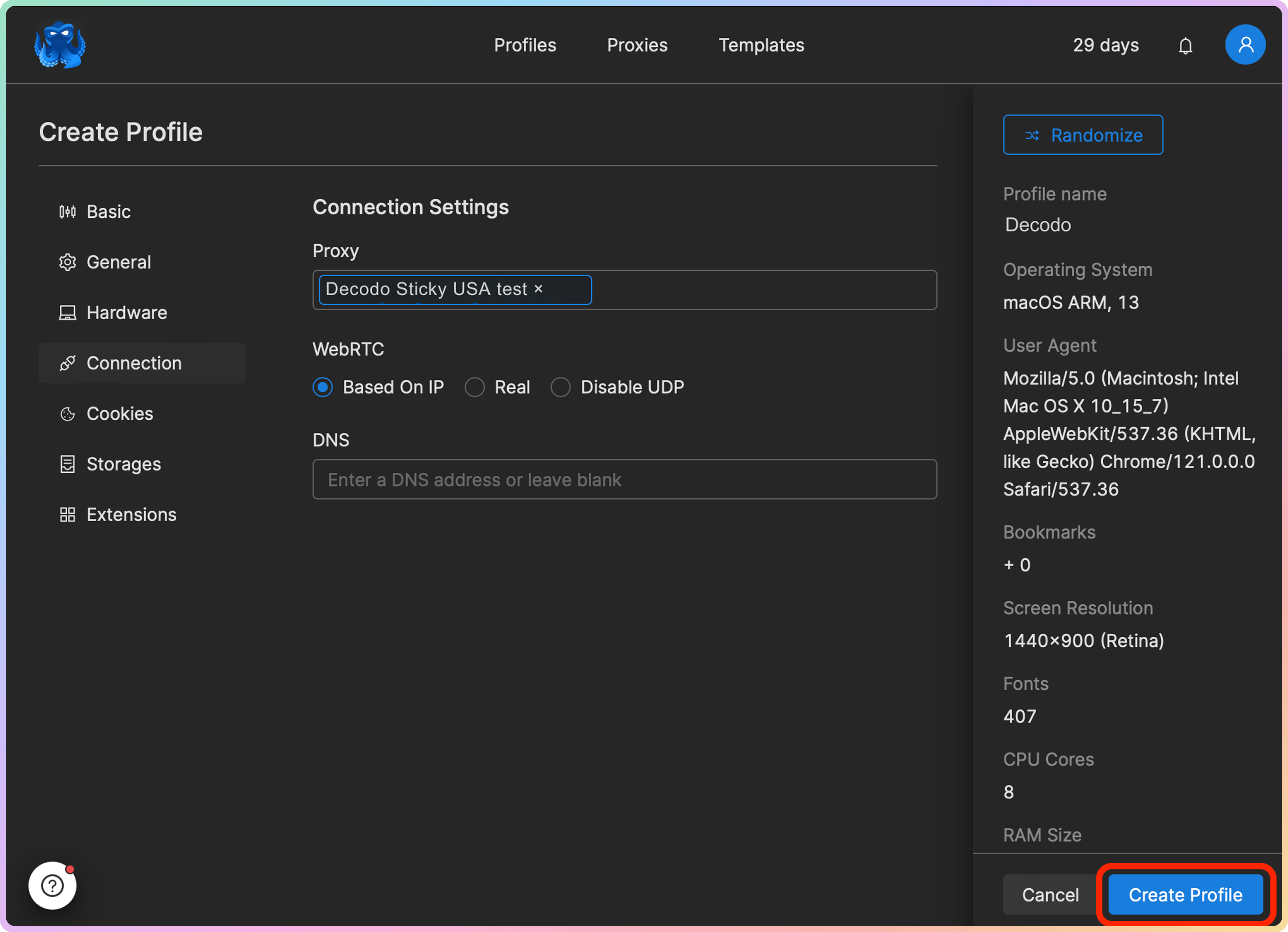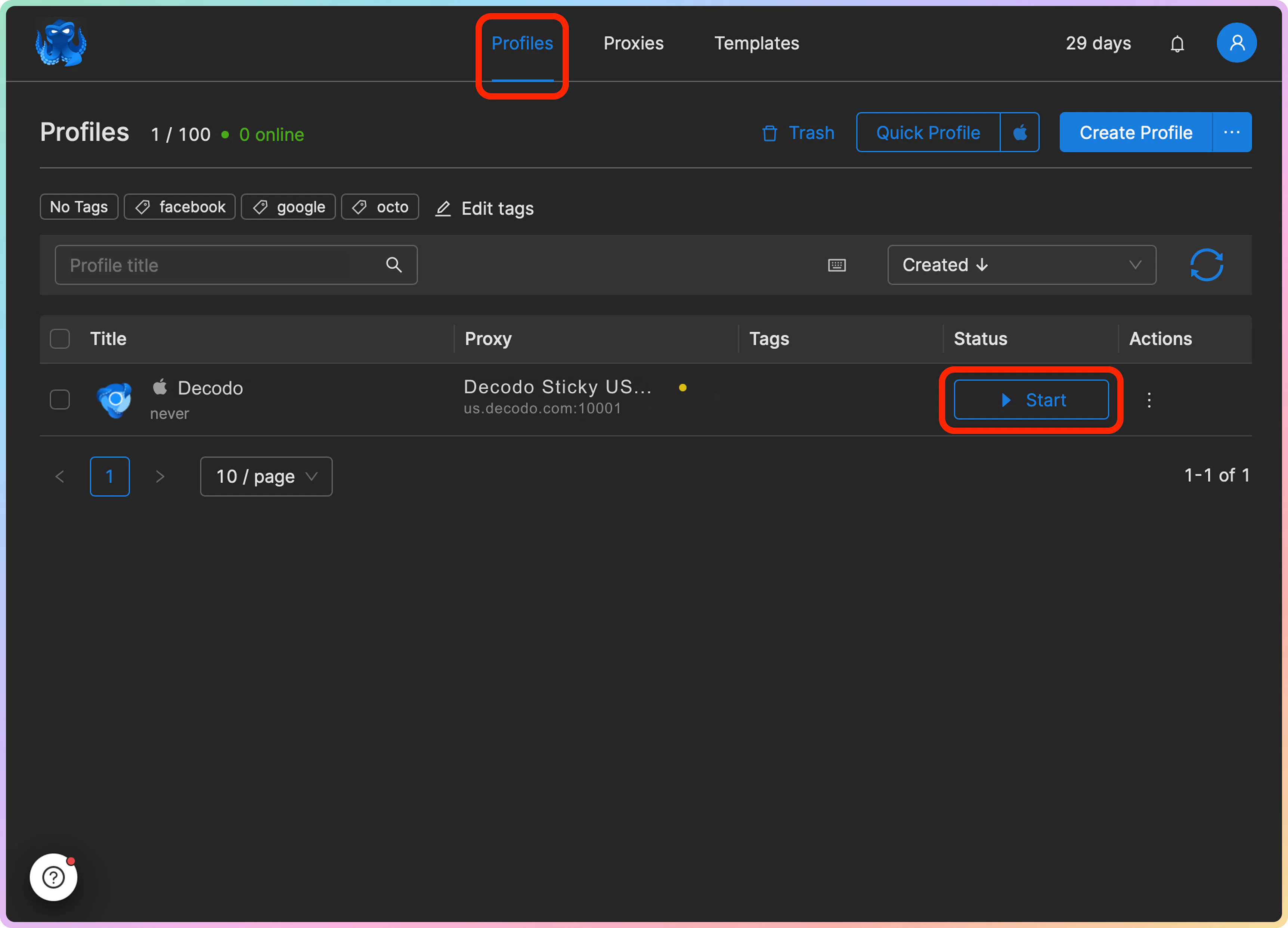 创建配置文件并将代理链接到它后,您可以通过点击 Start(启动)从 Profiles(配置文件)部分启动它。