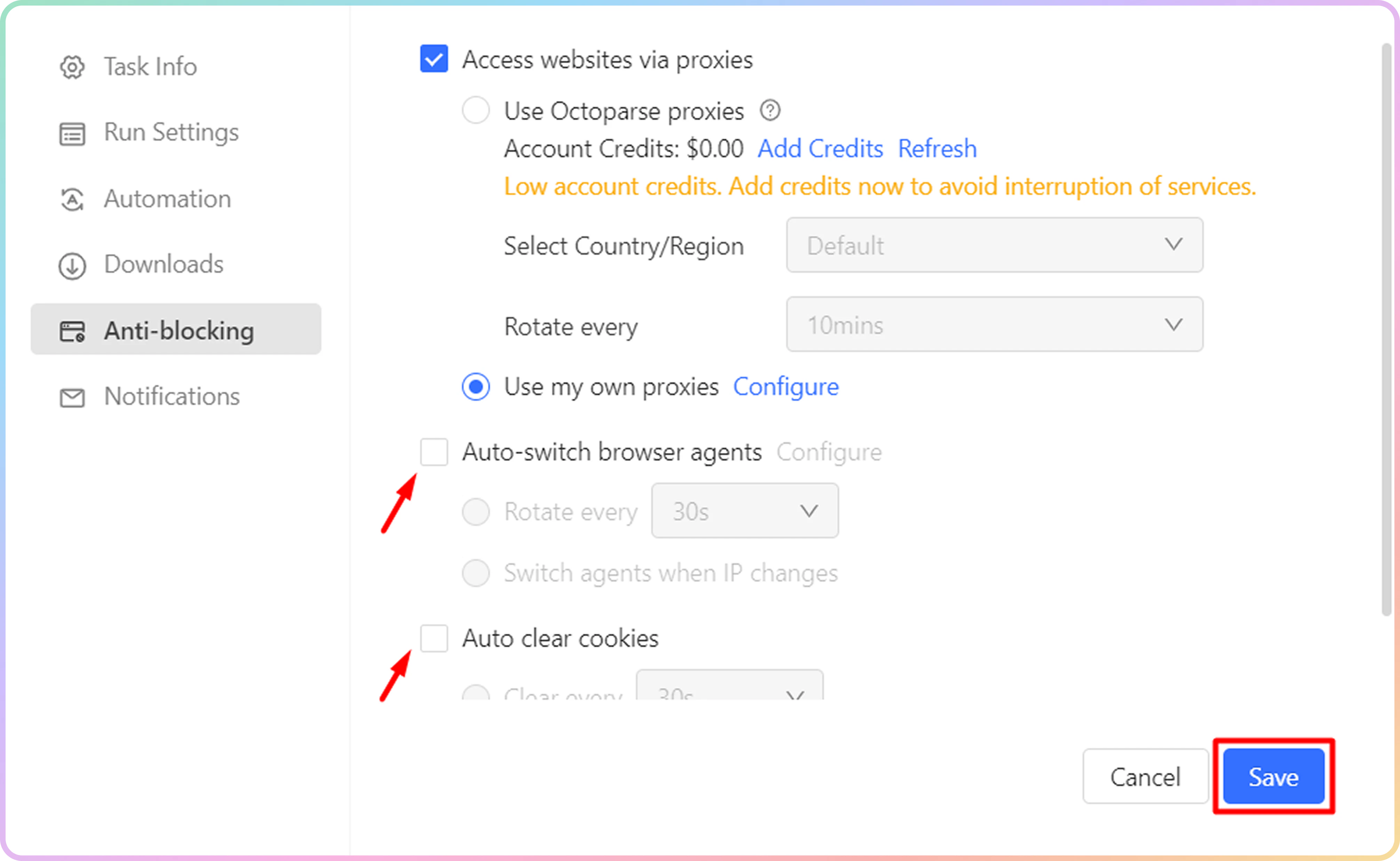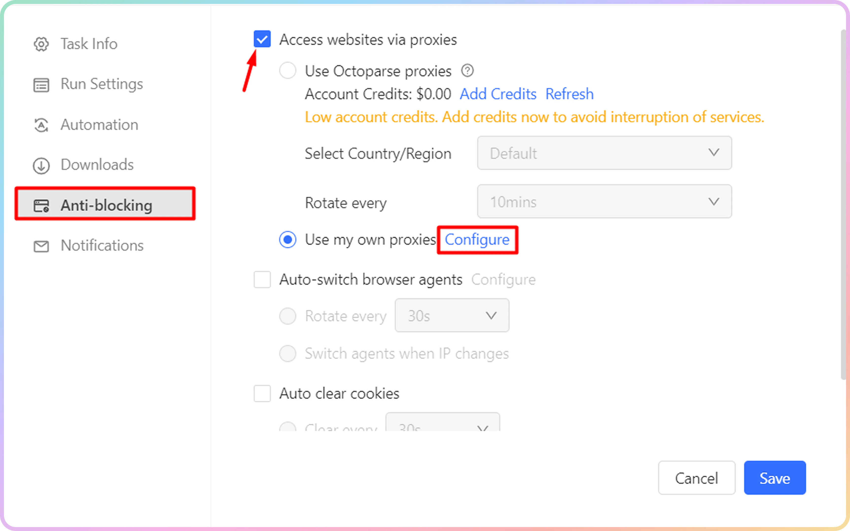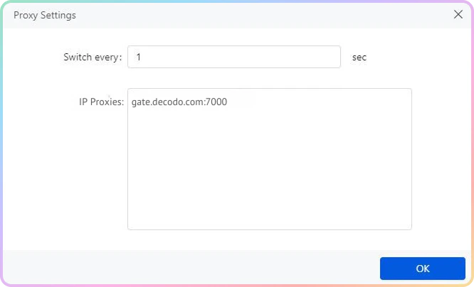 在代理设置弹出窗口中,定义您想要使用的代理。不幸的是,Octoparse 仅提供