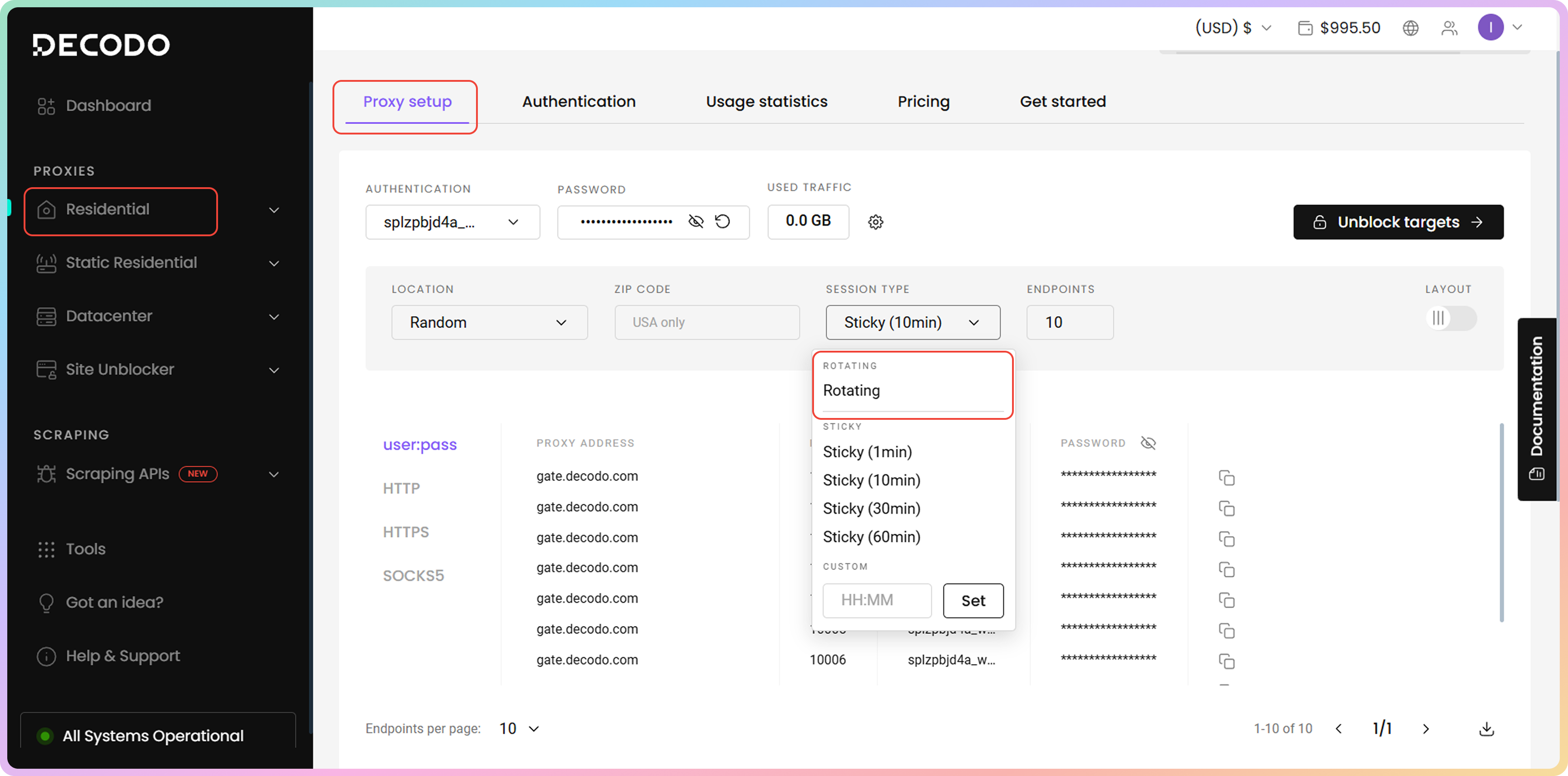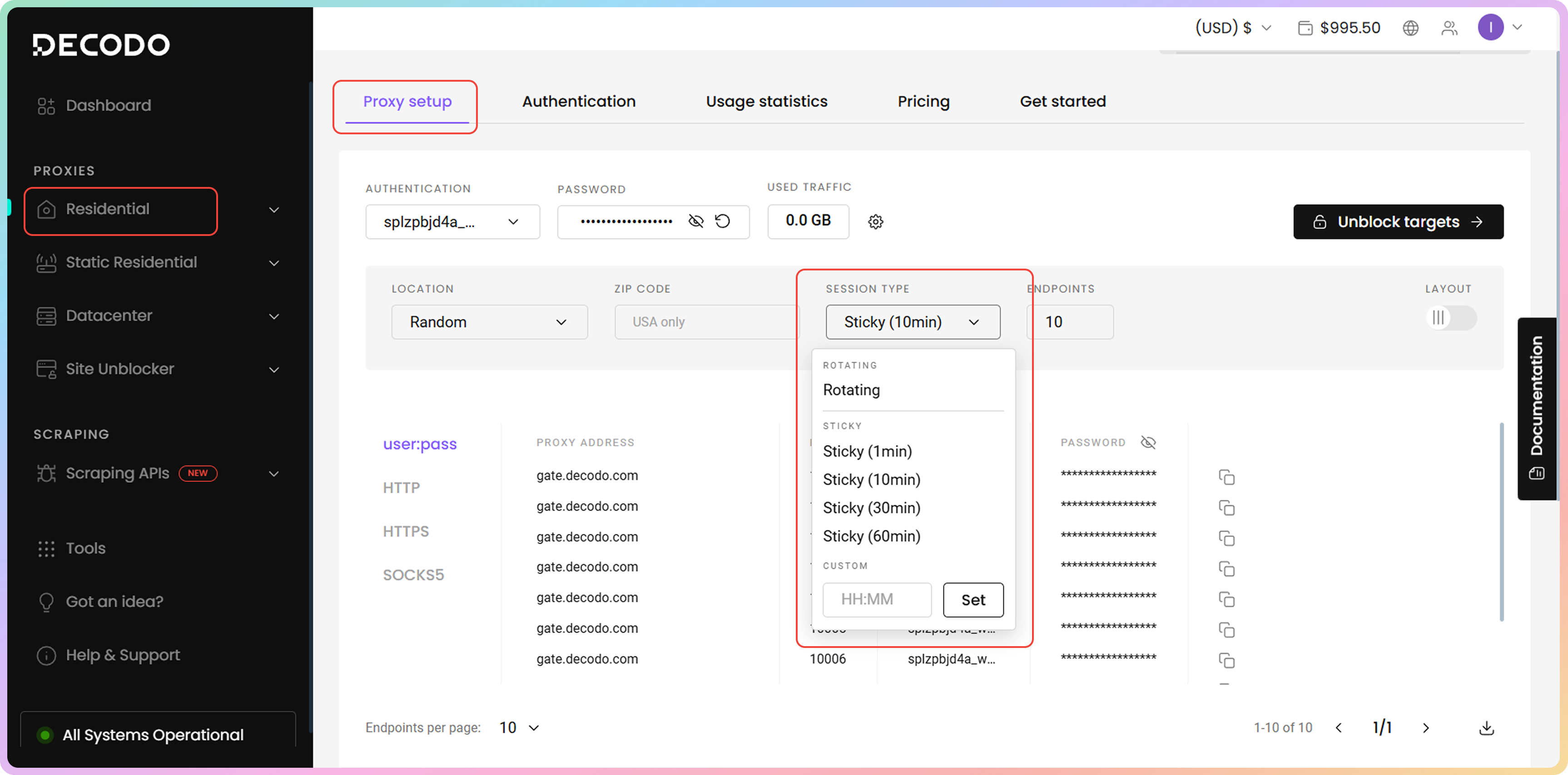 要选择粘性会话类型,请导航至代理设置部分并使用下拉菜单。 一旦您与粘性端口建立第一次连接,IP地址将在指定的持续时间内保持不变,无论发出多少请求。住宅端点在仪表板下拉菜单中有四个选项:1、10、30或60分钟。您还可以手动指定最长24小时的自定义持续时间。