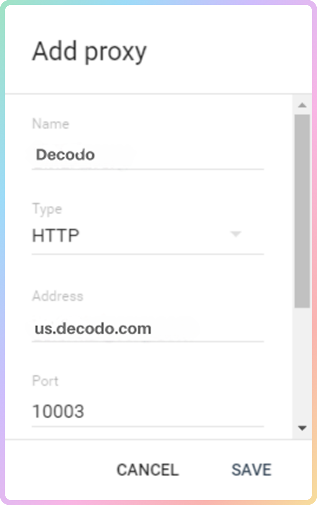 us.decodo.com和10003。 - 在 Username 和 Password 字段中,相应地输入您的代理用户凭据。如果您使用的是白名单 IP 地址,则可以跳过这些字段。了解更多关于我们的身份验证方法。