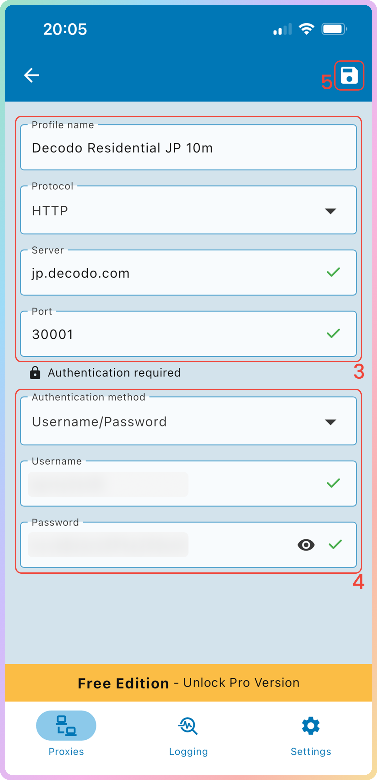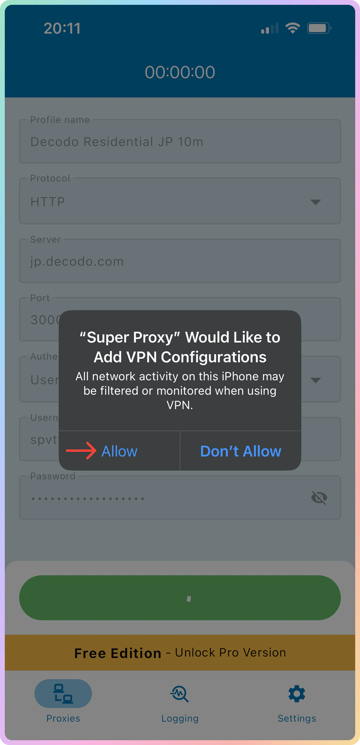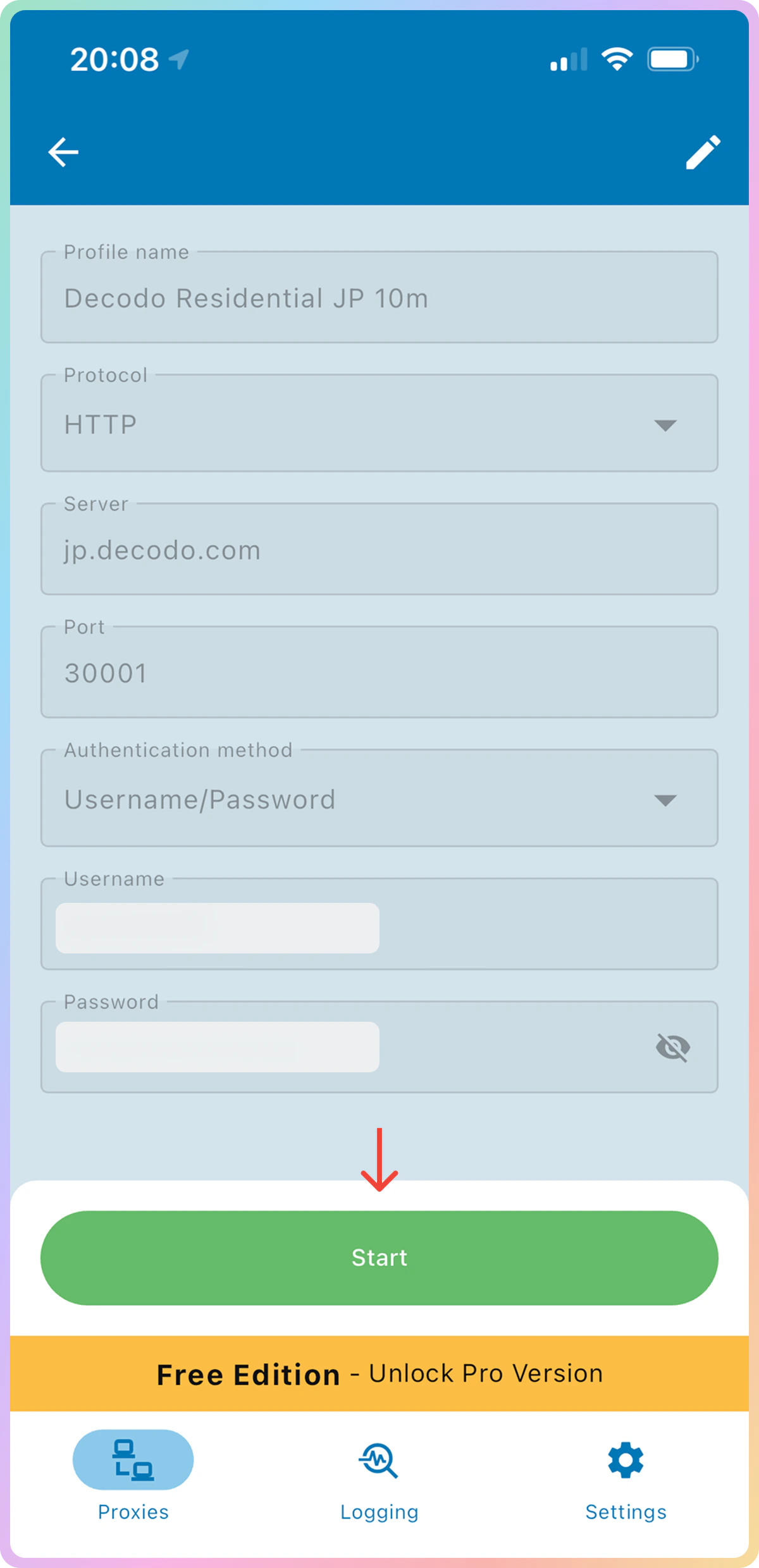 us.decodo.com:10101)。 - 如有必要,请尝试此处的解决方法,但它只能暂时工作,之后需要再次更新设置。