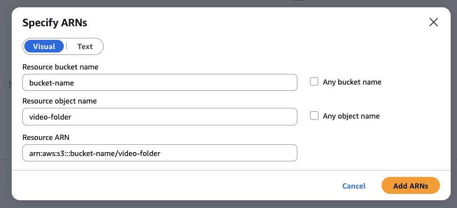 - 在资源下,选择特定,点击添加 ARN,添加您的存储桶名称和视频文件夹名称: