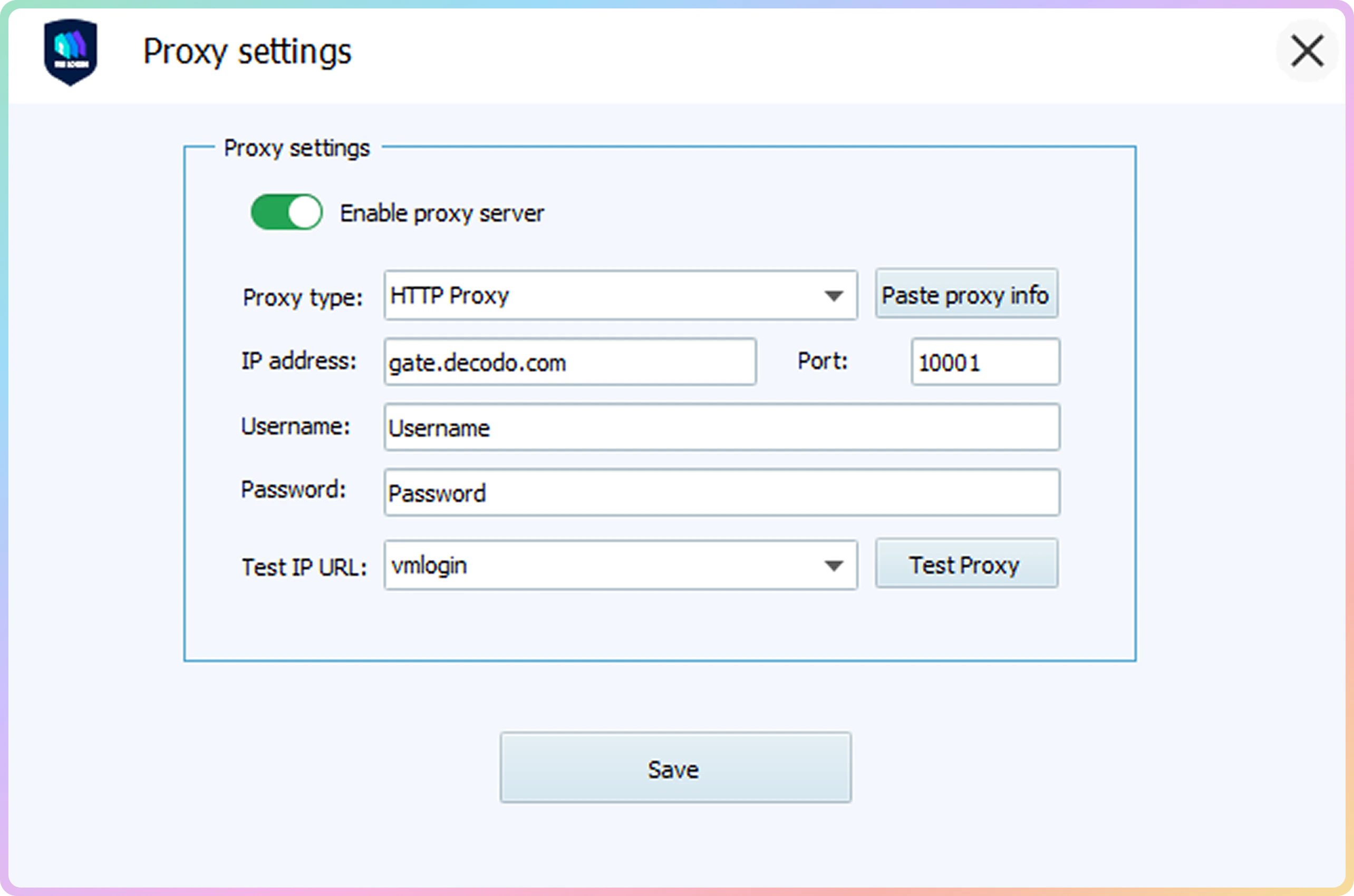 在下拉菜单中选择 HTTP 代理,然后输入代理详细信息,这些信息可以在您的 Decodo 仪表板上找到。以下是住宅代理的示例: