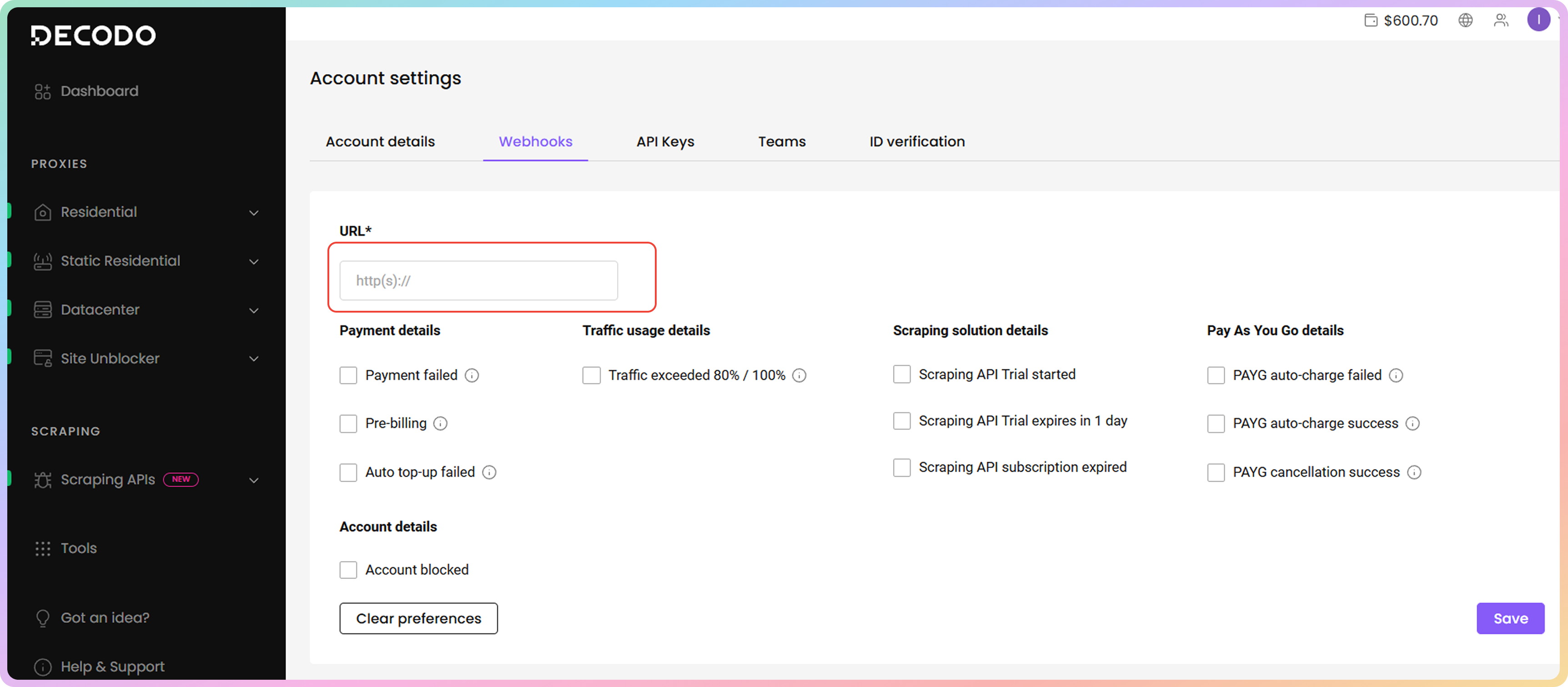 输入您希望接收 webhook 的 URL(您可以随时更改 URL)。